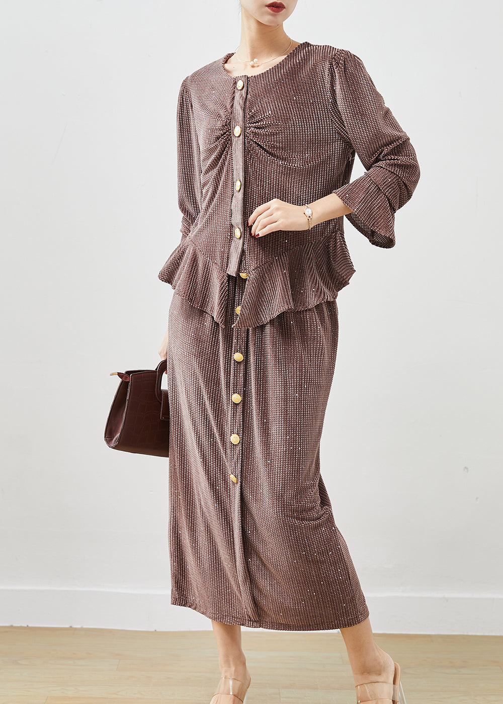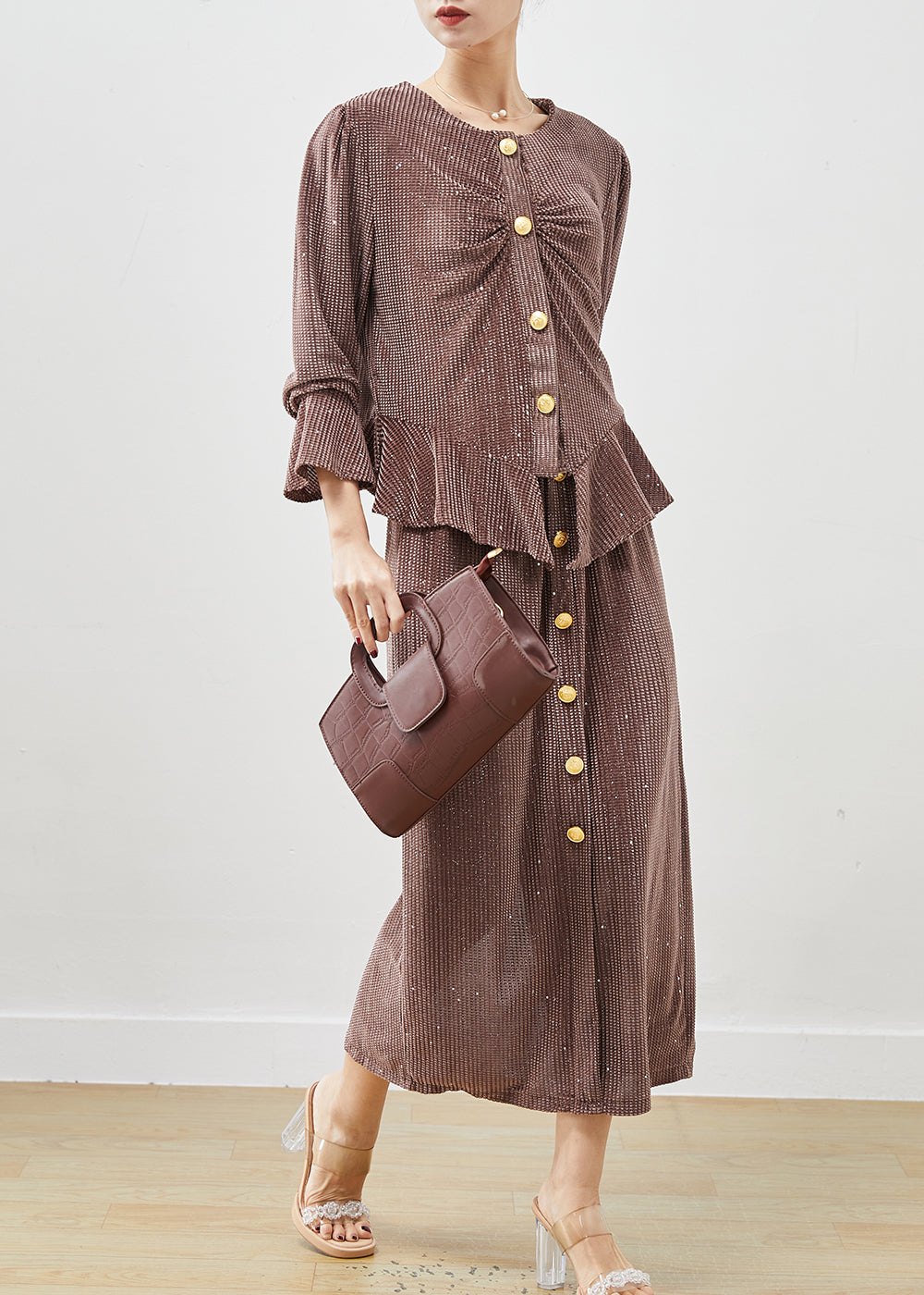 Art Khaki Sequins Patchwork Ruffles Cotton Two Pieces Set Spring