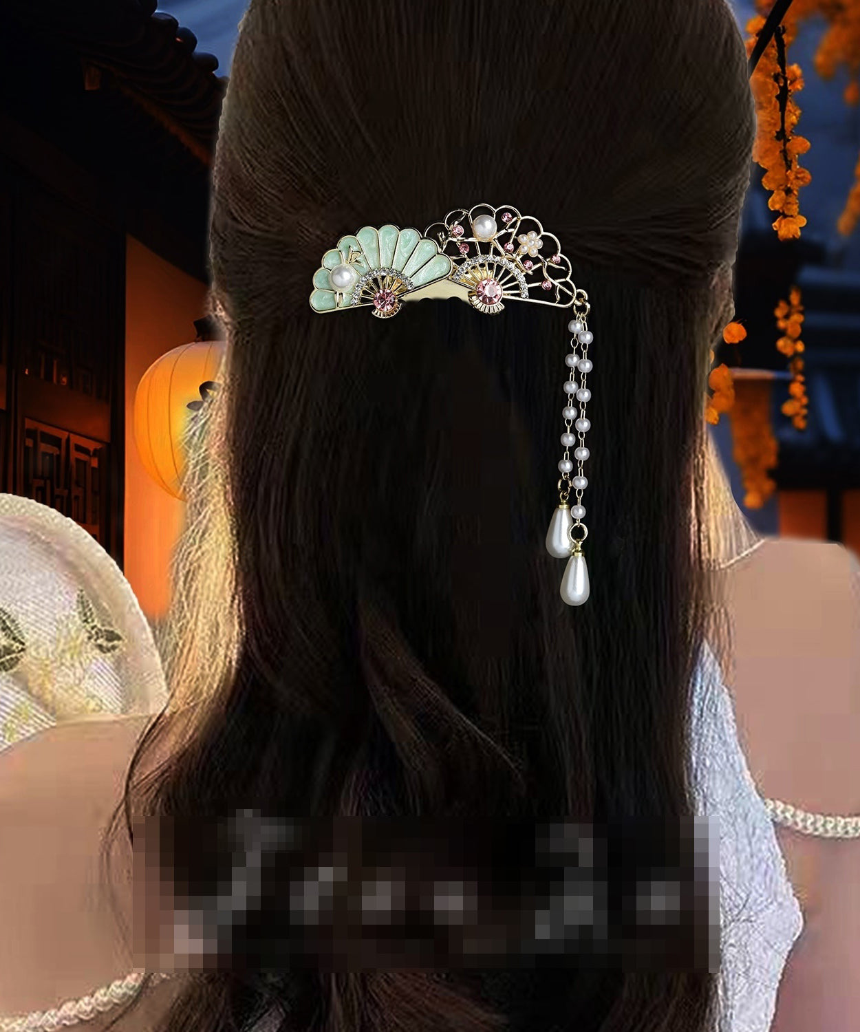 Style Light Green Alloy Zircon Pearl Hollow Out Fan-Shaped Tassel Hairpin