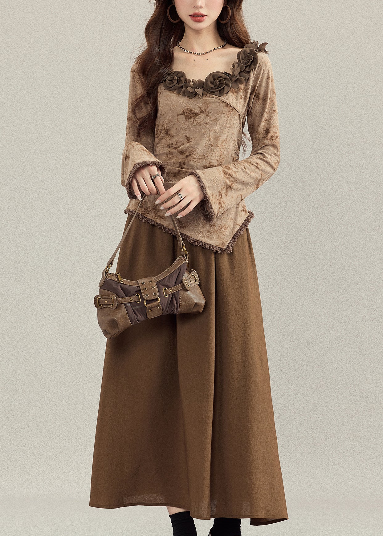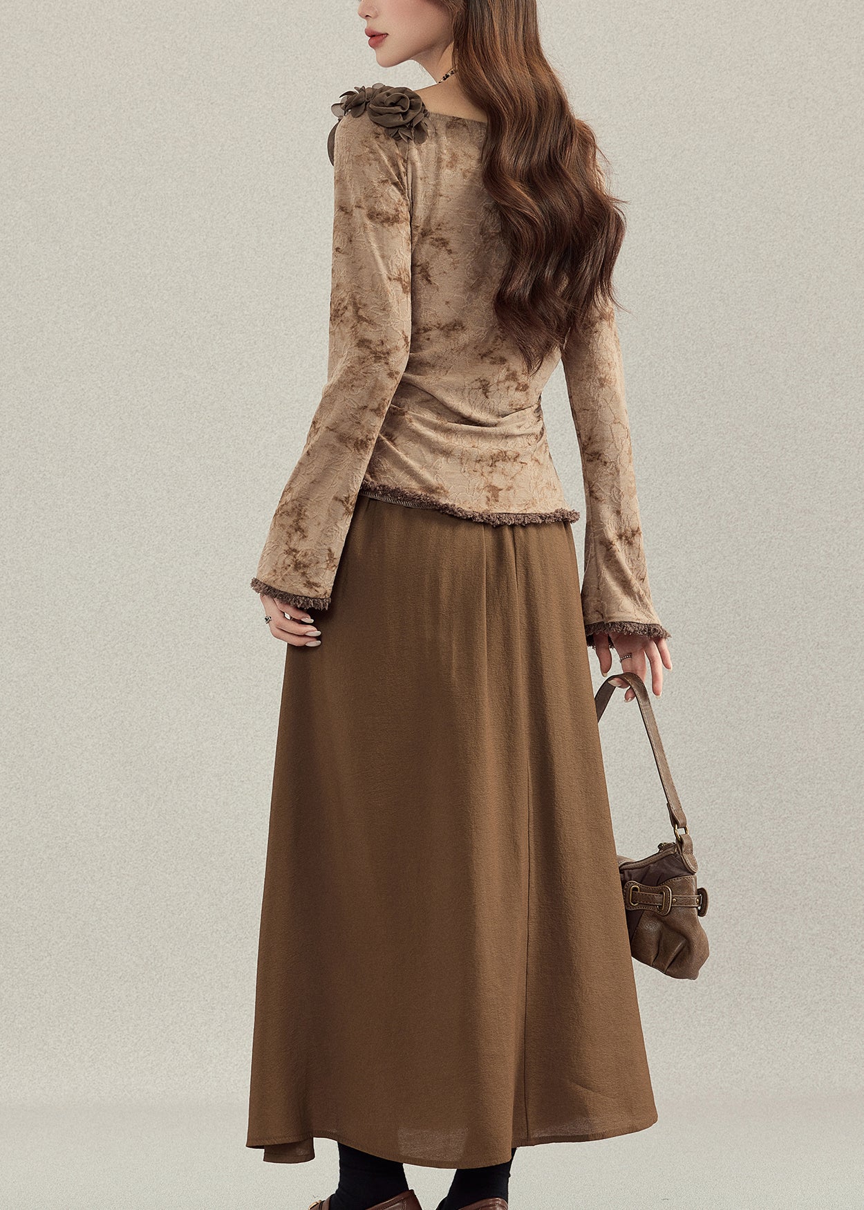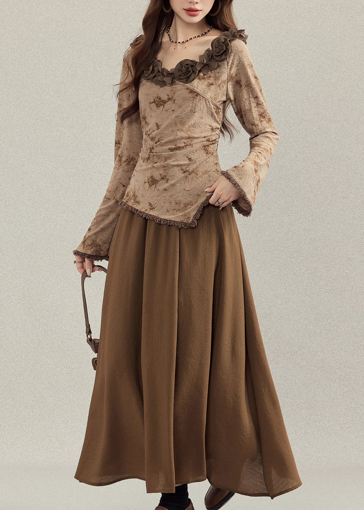 French Coffee Asymmetrical Floral Cotton Women Sets 2 Pieces Fall