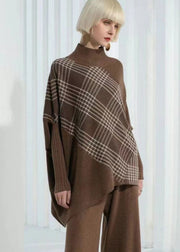 Handmade Khaki Turtle Neck Thick Plaid Knitted Tops Batwing Sleeve
