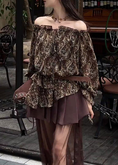 Style Chocolate Cold Shoulder Print Cotton Blouse Top Fall