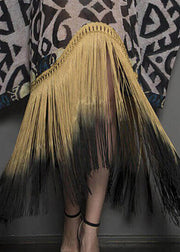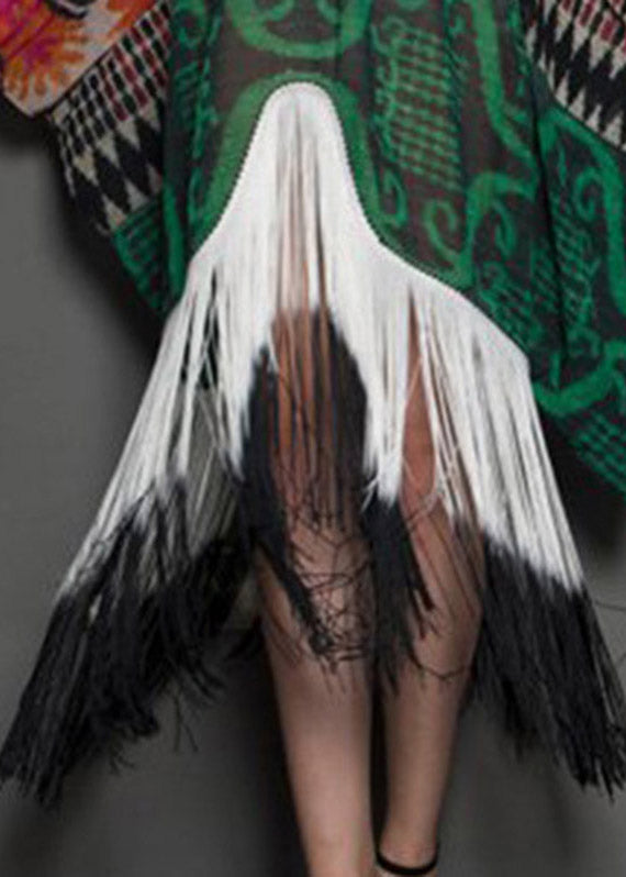 Novelty White V Neck Asymmetrical Print Tassel Patchwork Long Dress Long sleeve