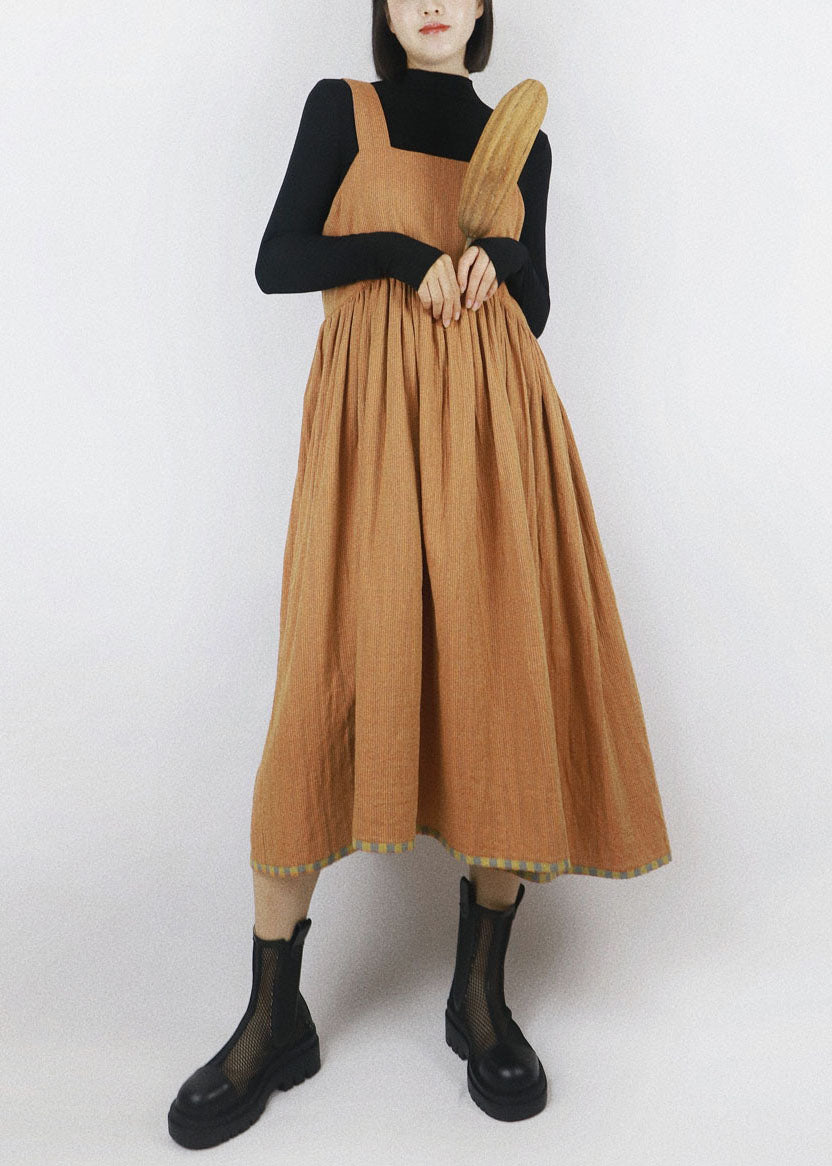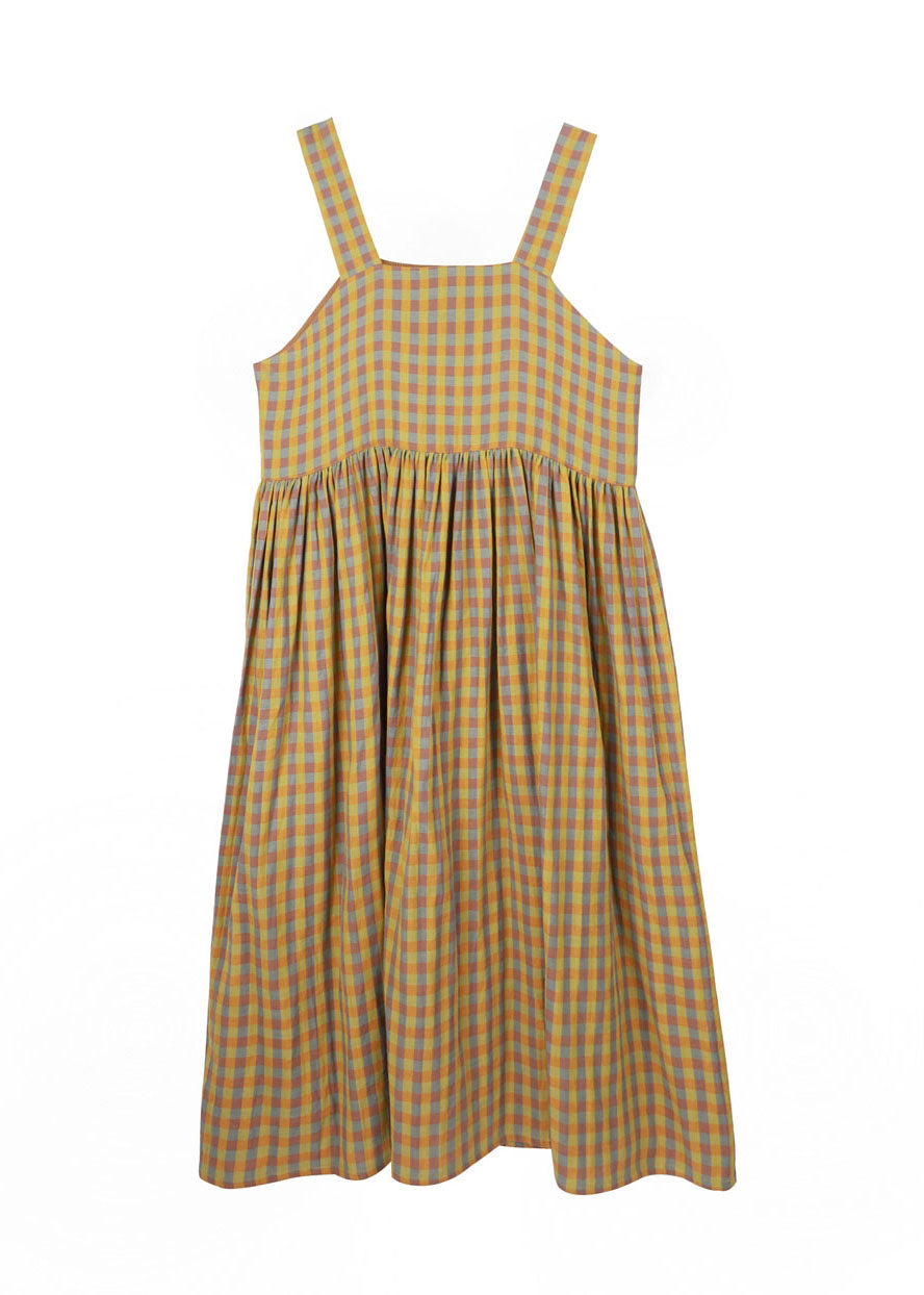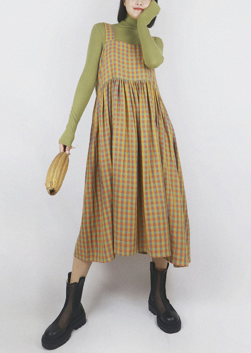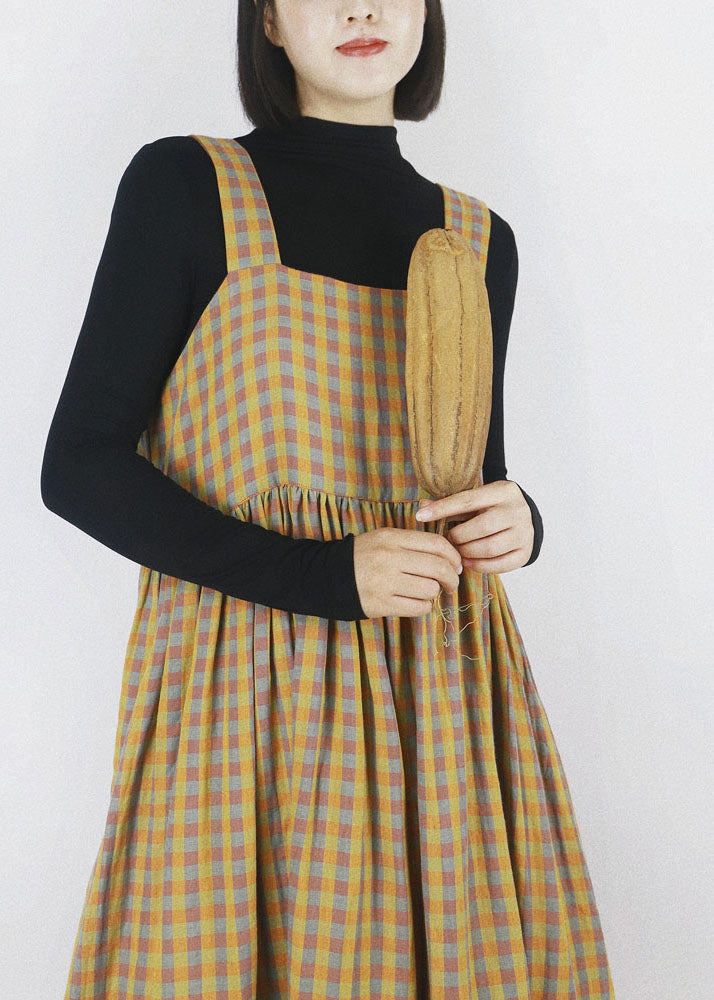 DIY Yellow Plaid Patchwork Wrinkled Wear On Both Sides Cotton Vacation Strap Dresses Summer
