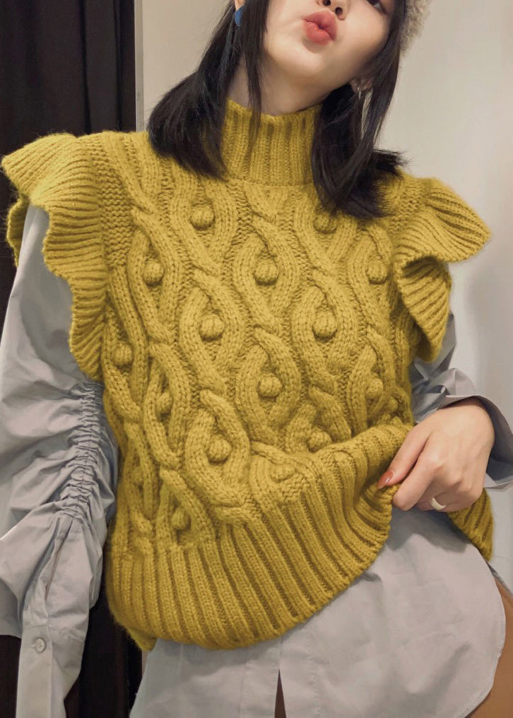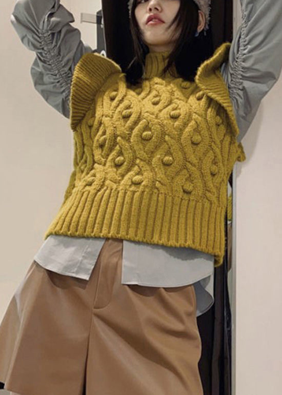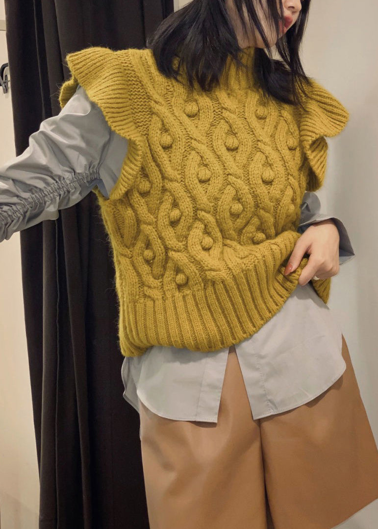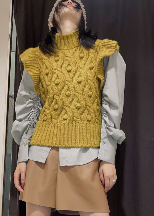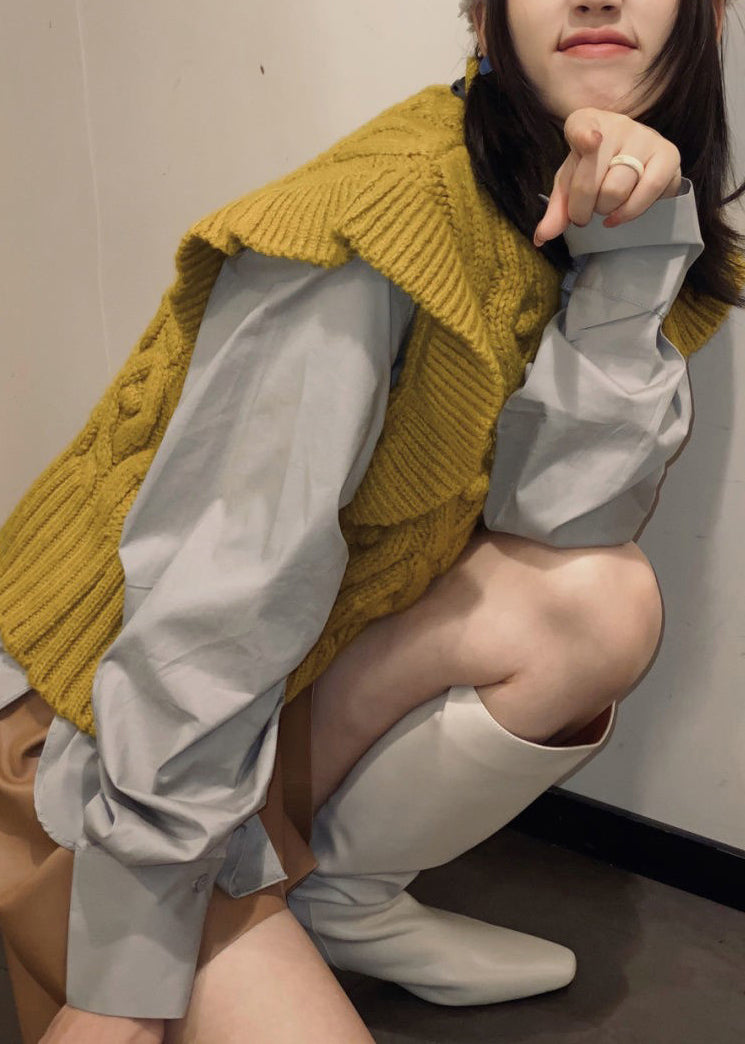 Italian Yellow Ruffles Turtle Neck cable knit vest Grey wrinkled Shirt top two Piece Outfit Spring