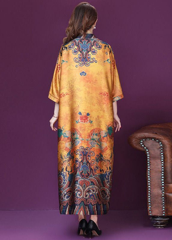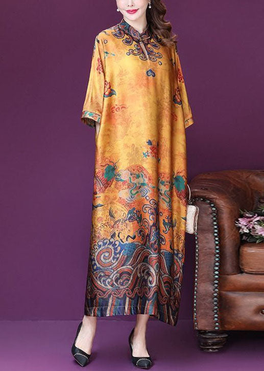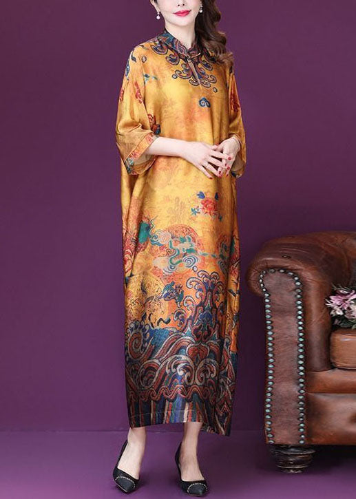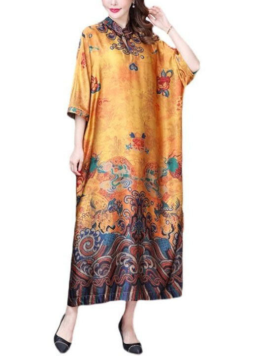 Plus Size Yellow Mandarin Collar Print Silk Dresses Batwing Sleeve
