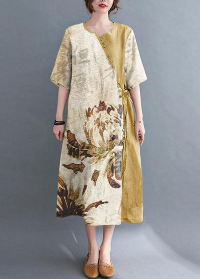 Natural Yellow O-Neck Print Wrinkled Long Dress Spring