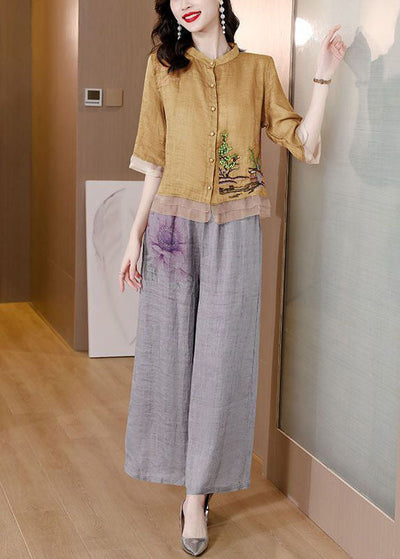 Boho Yellow Embroideried Patchwork Linen Two Pieces Set Summer