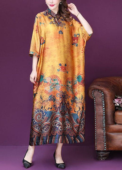 Plus Size Yellow Mandarin Collar Print Silk Dresses Batwing Sleeve
