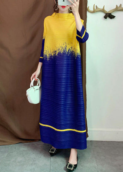 Sexy Yellow O-Neck Zippered Print Wrinkled Maxi Dress Long Sleeve