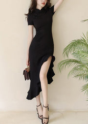 Chinese Style Black Stand Collar Asymmetrical Long Dress Short Sleeve