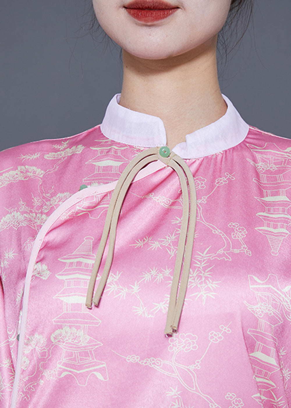 Women Pink Mandarin Collar Patchwork Tassel Silk Long Dresses Summer