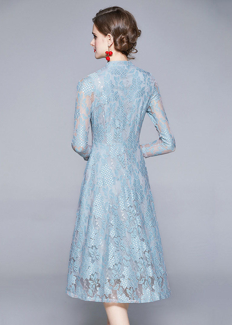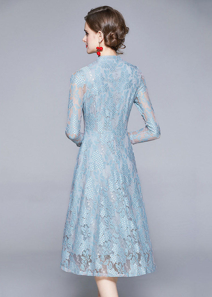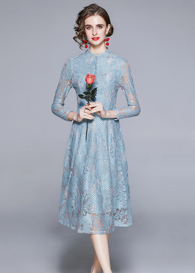 Style Blue Stand Collar Hollow Out Patchwork Lace Dress Summer