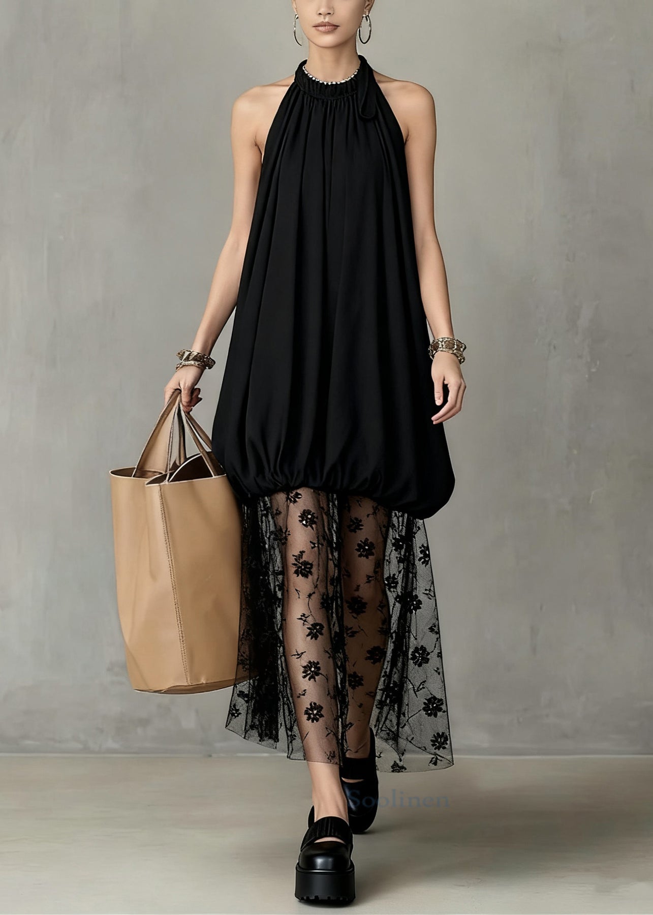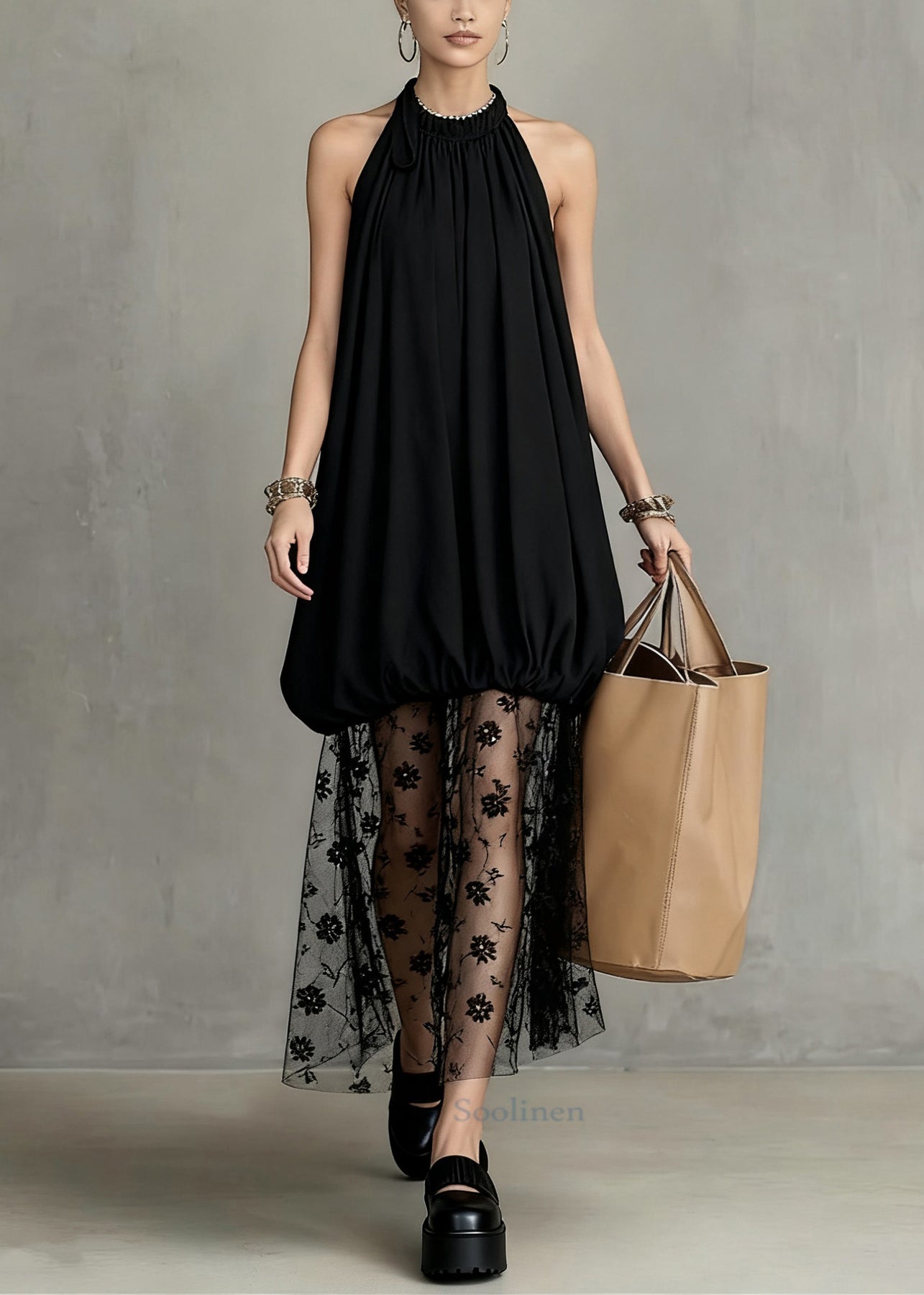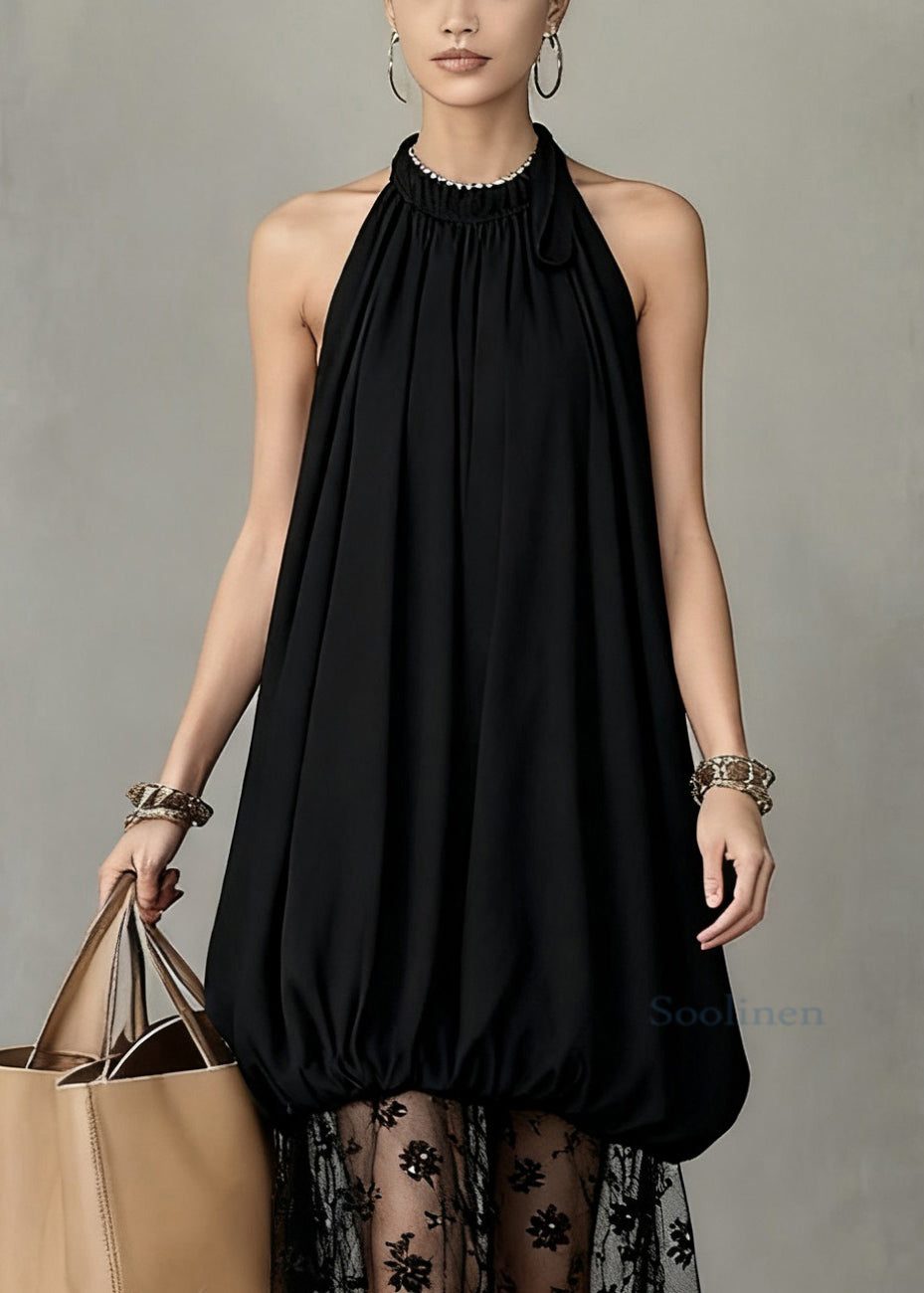 Stylish Black Wrinkled Lace Tulle Patchwork Dress Sleeveless