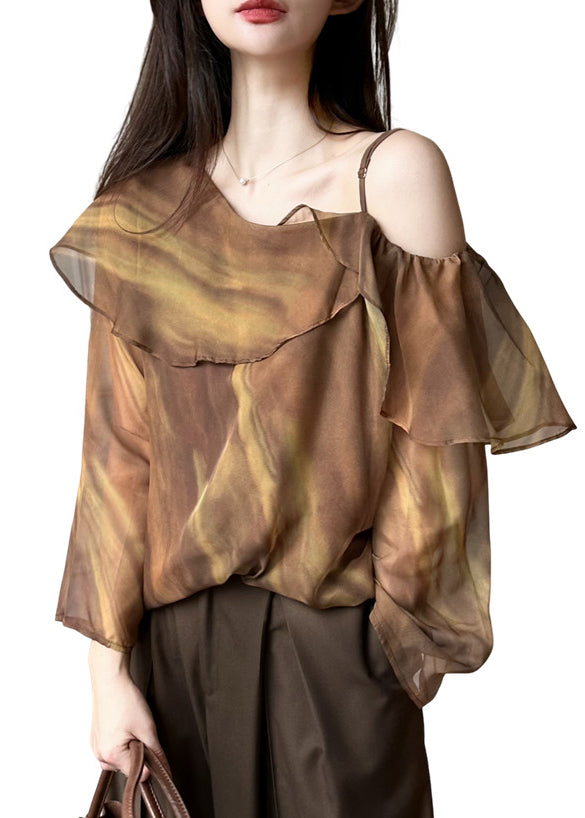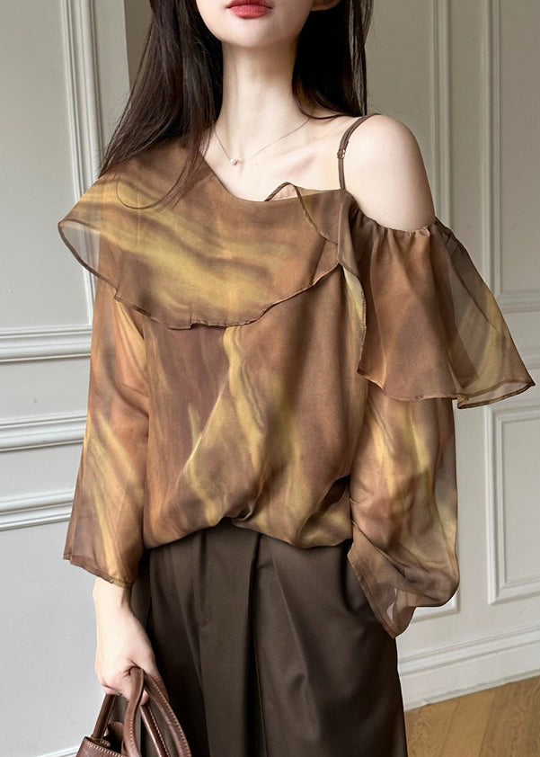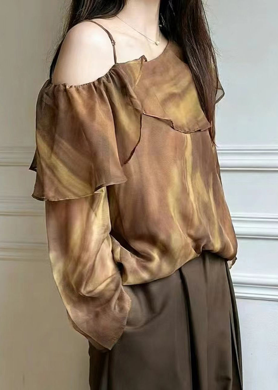 Beautiful Brown One Shoulder Tie Dye Chiffon Blouse Top Spring