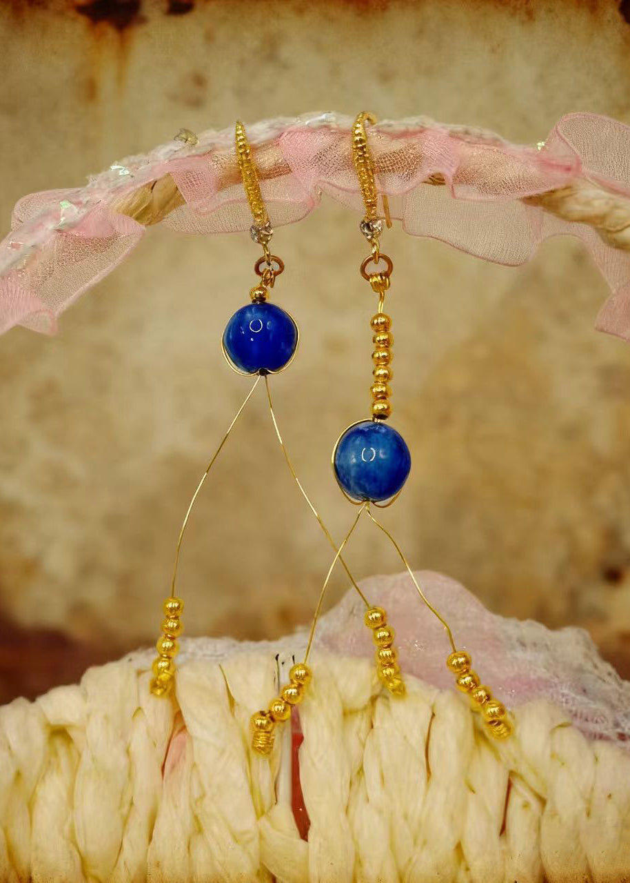 Retro Peacock Blue Tasseled Gem Stone Drop Earrings