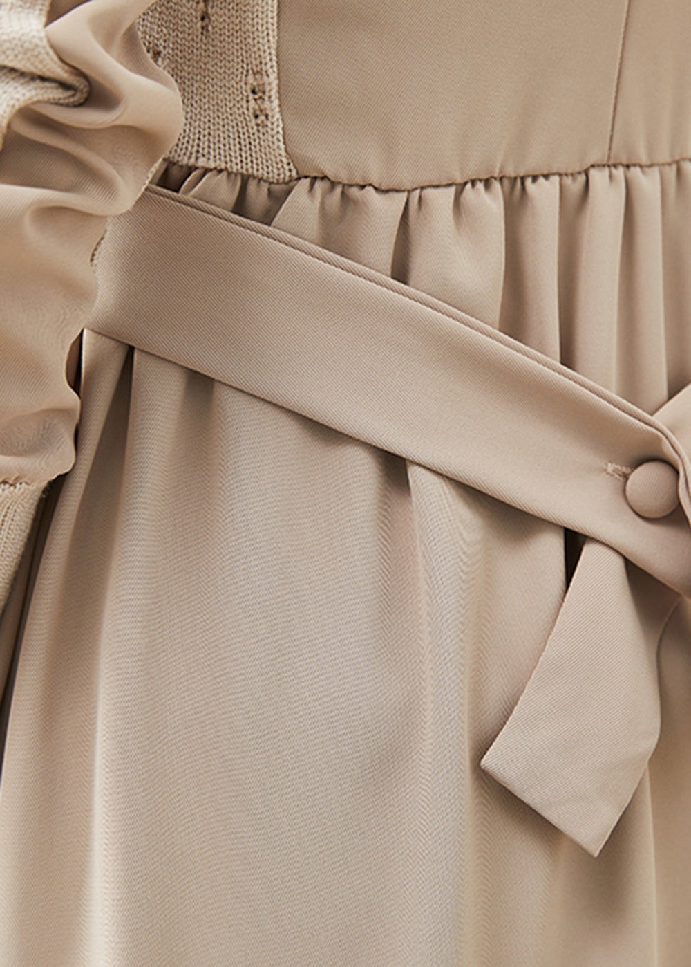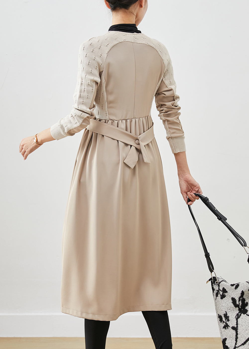 Classy Beige Chinese Button Knit Patchwork Cotton Long Dress Fall