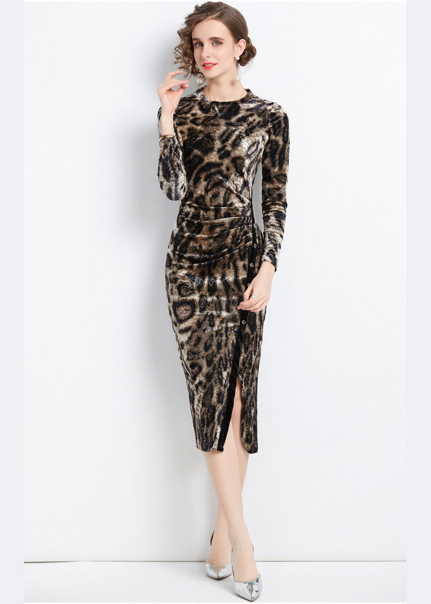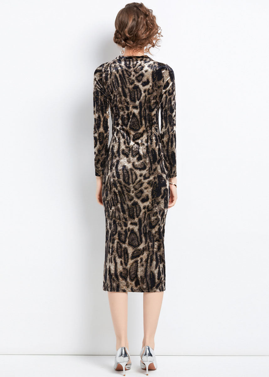 Slim Fit Leopard Print Side Open Wraped Silk Velour Dress Fall