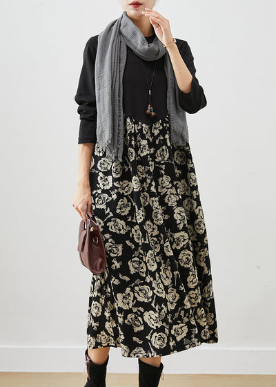 Loose Black Ruffled Print Patchwork Cotton Mid Dress Spring