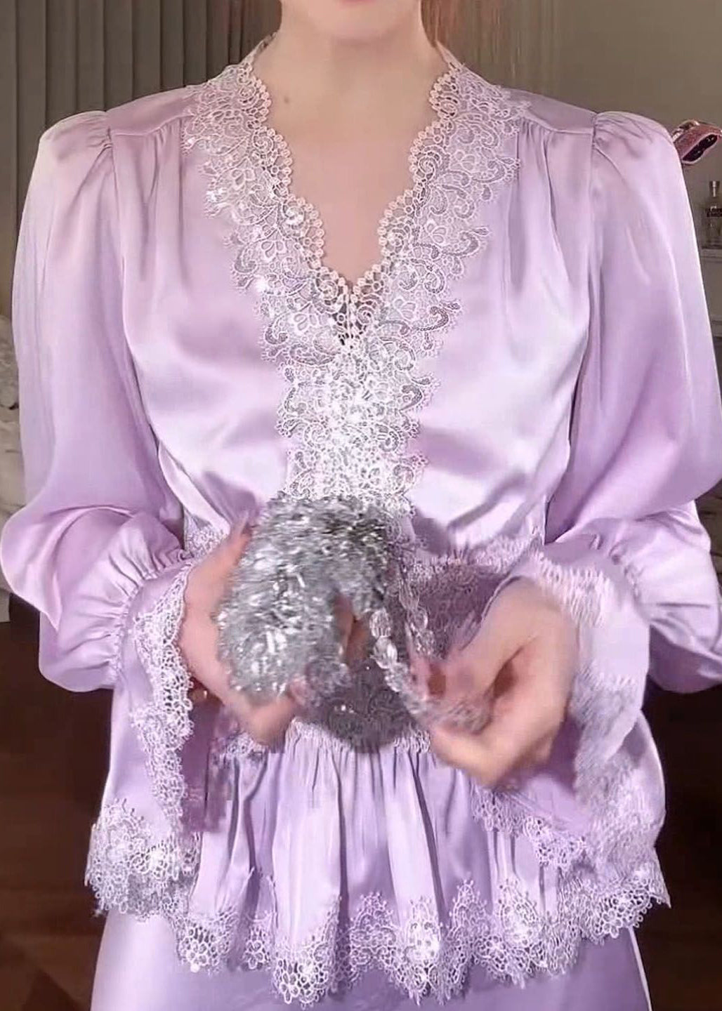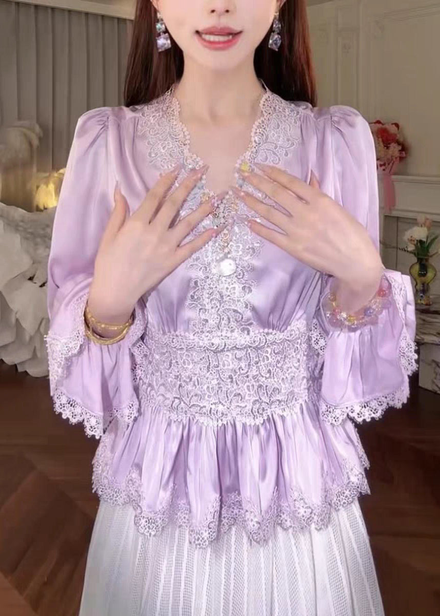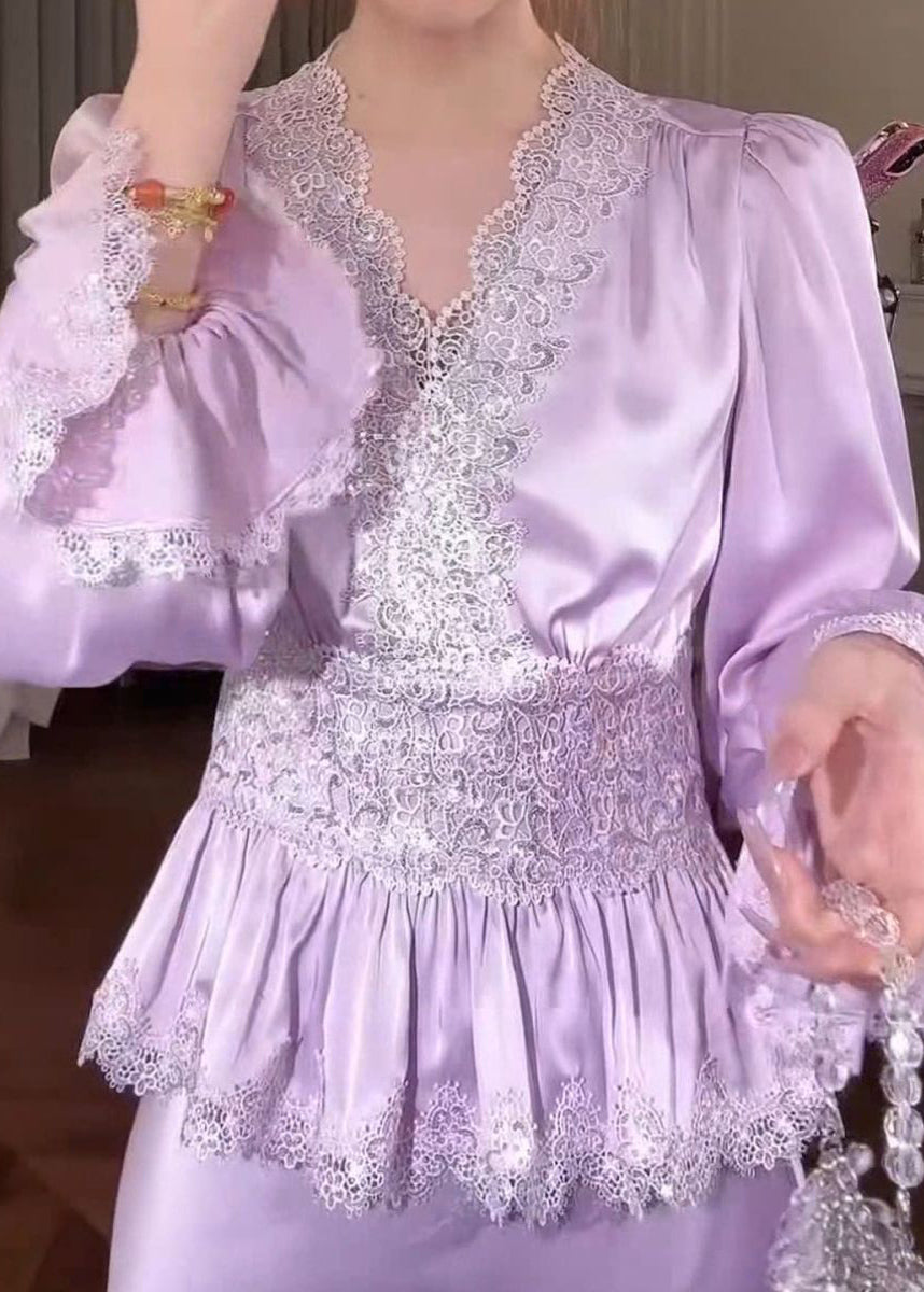 Purple Lace Solid Patchwork Silk Blouse Tops V Neck Fall