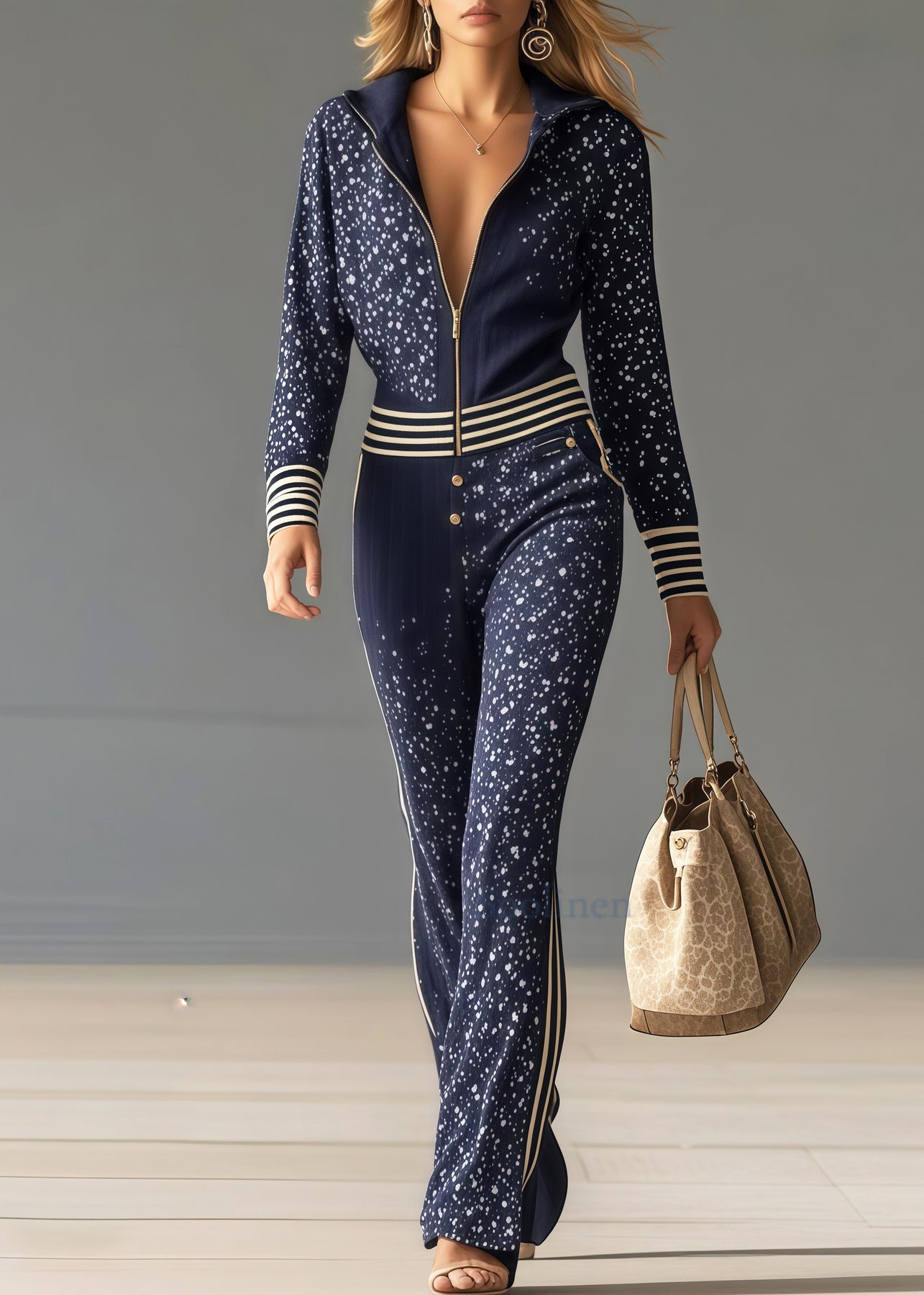 Italian Navy Print Patchwork Striped Chiffon Jumpsuit Spring