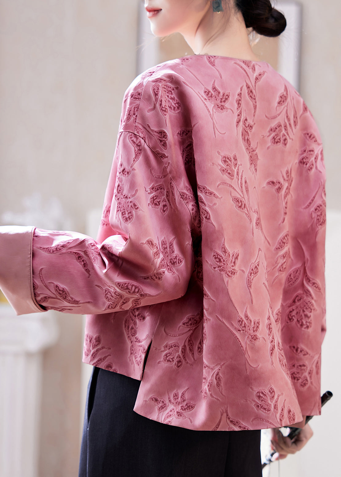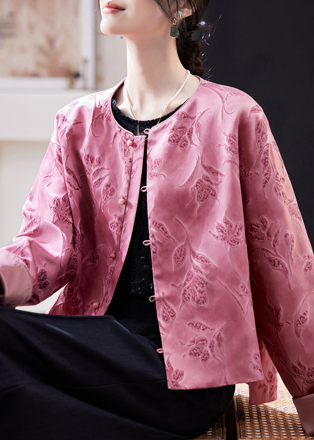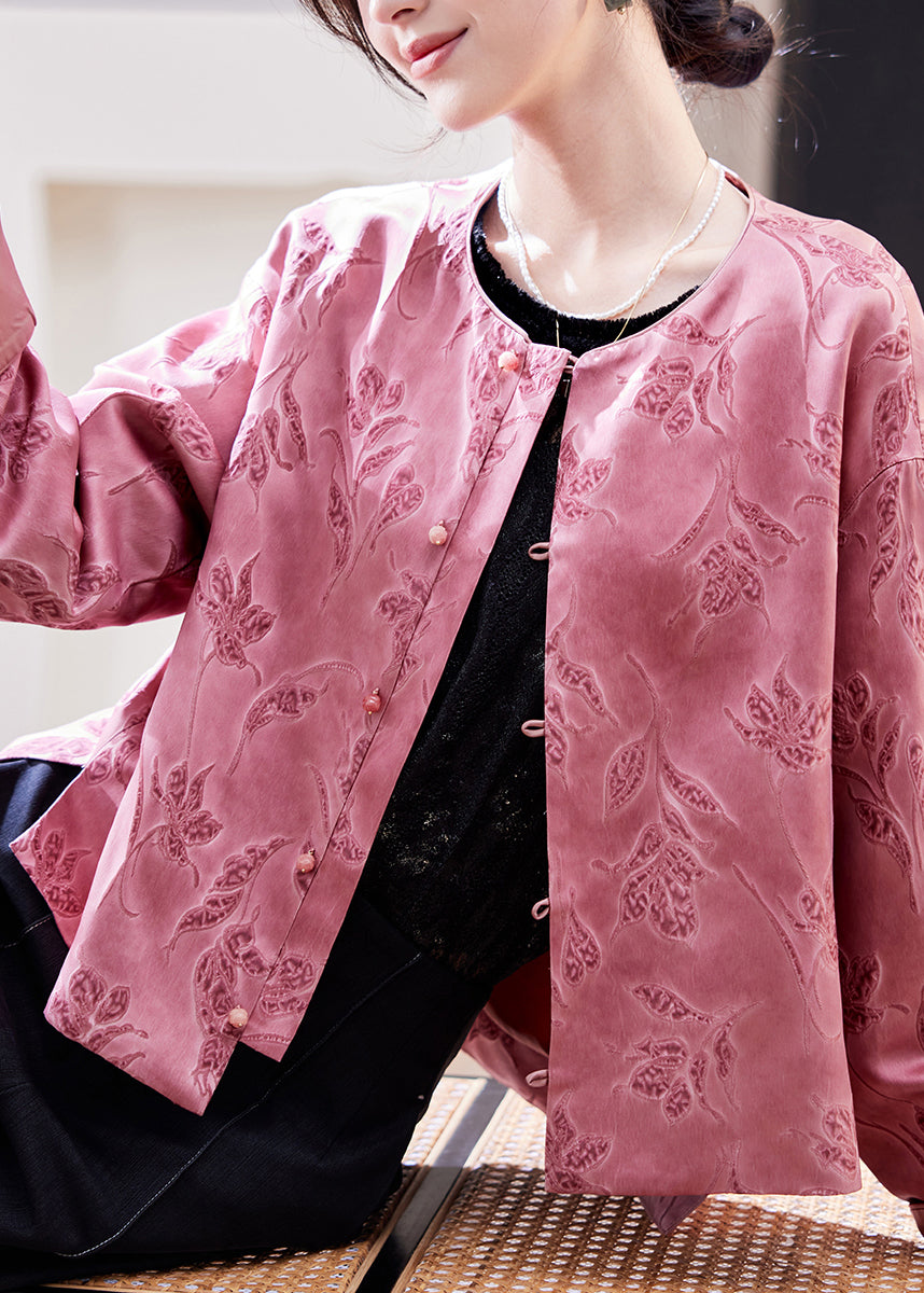 Chinese Style Pink O-Neck Print Coats Batwing Sleeve
