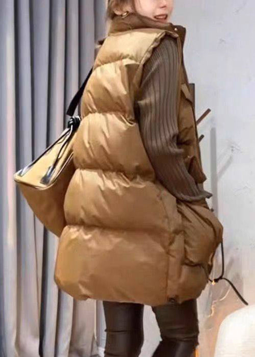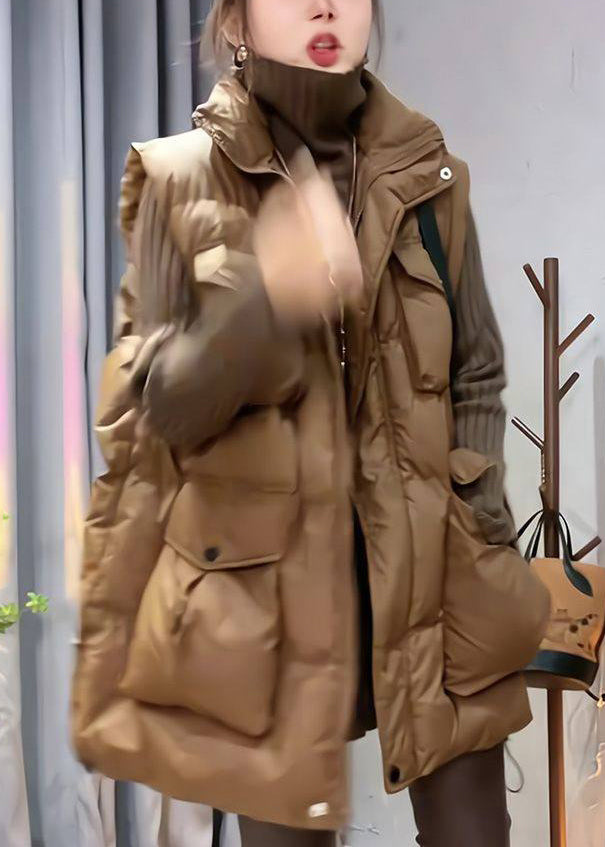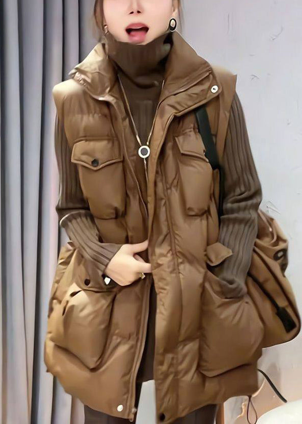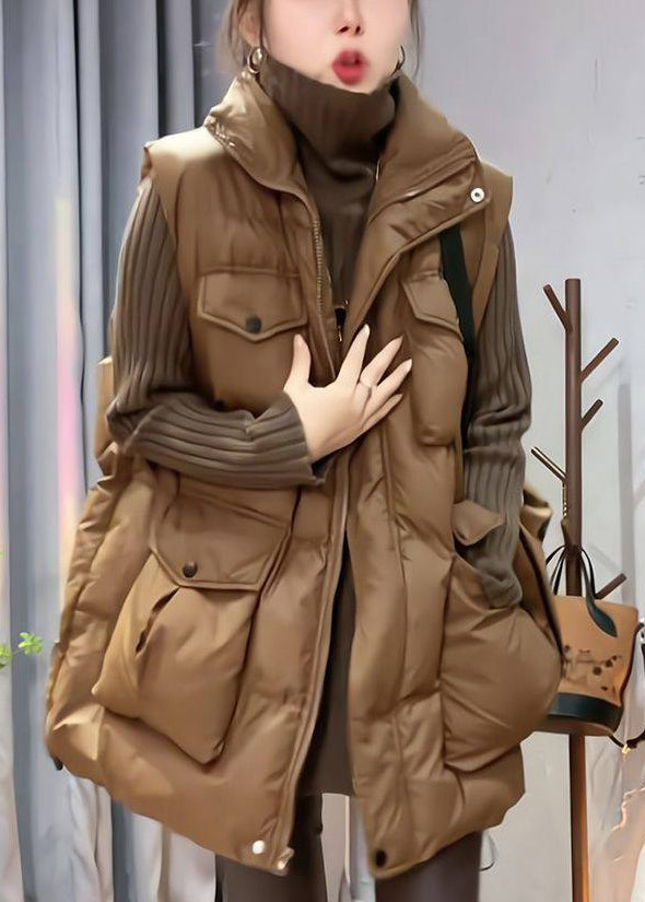 Loose Coffee Zippered Pockets Cotton Filled Waistcoat Sleeveless