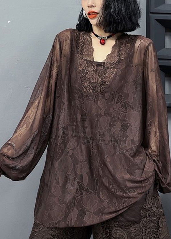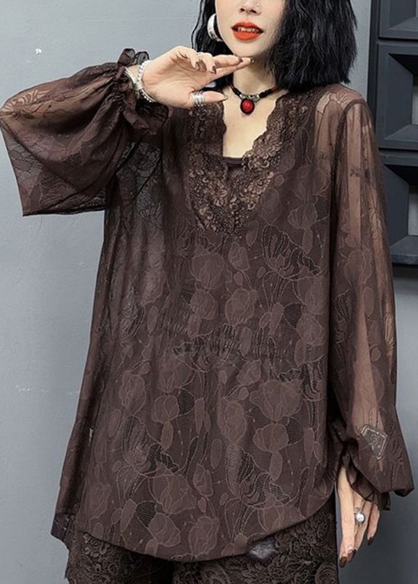Loose And Versatile Slim V Neck Long Sleeved Coffee Lace Top
