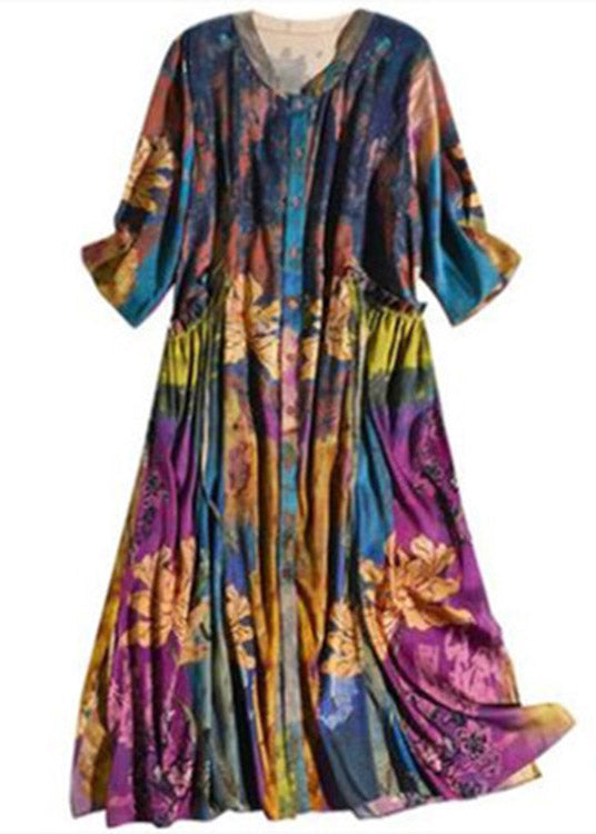 Boho V Neck Print Cinched Button Dresses Half Sleeve