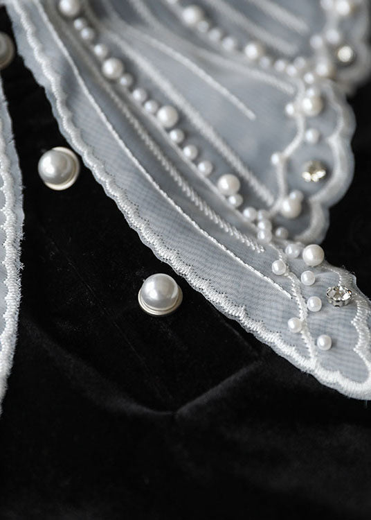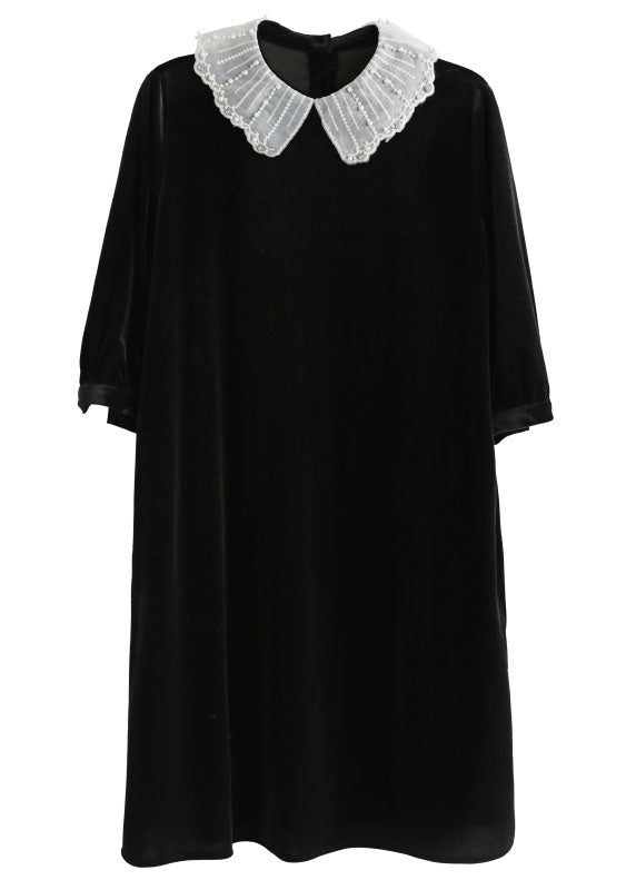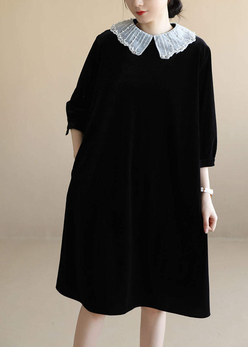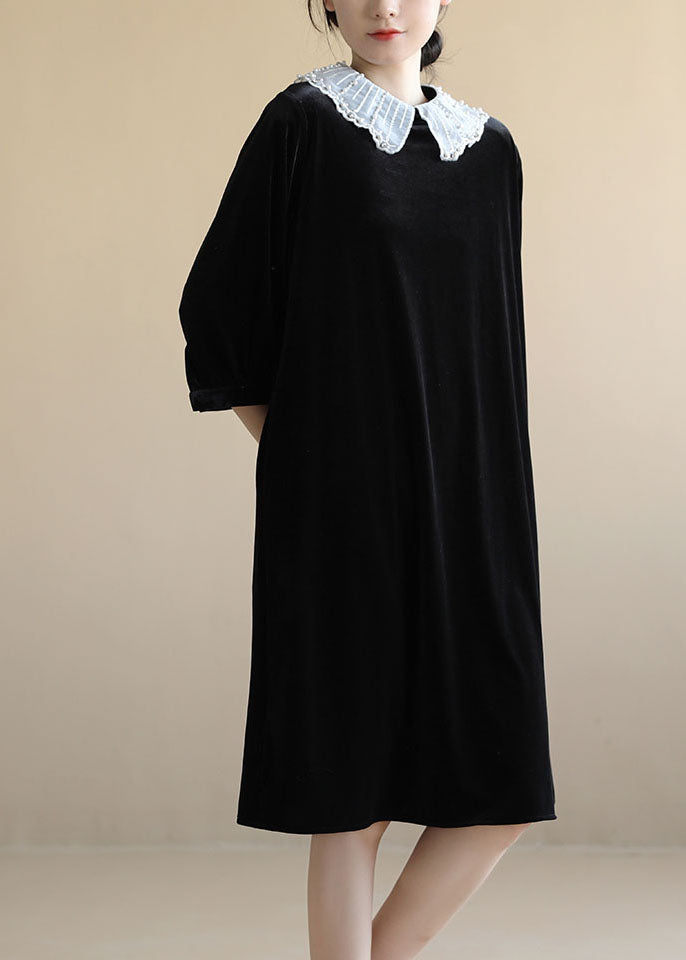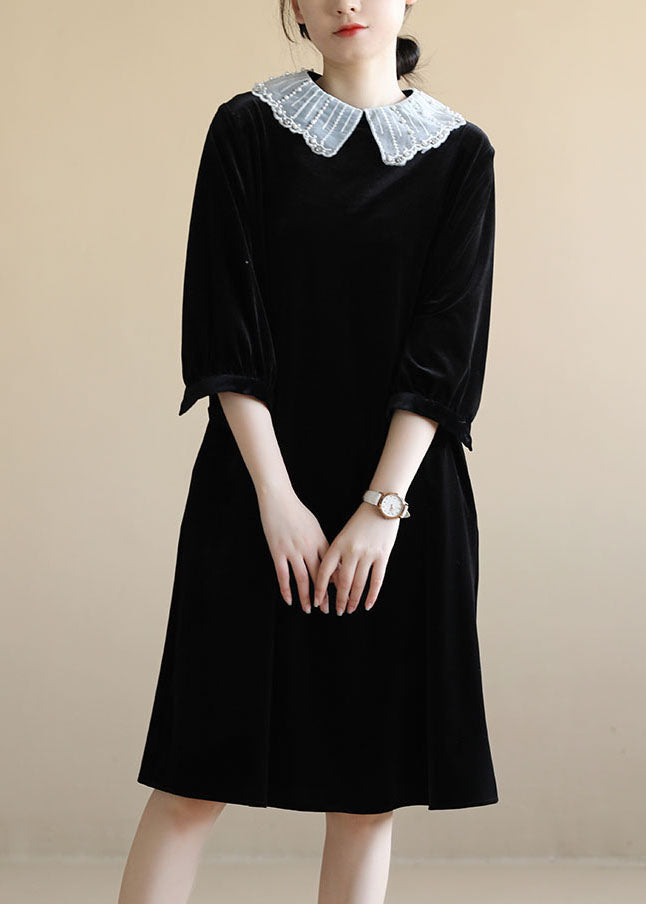 Simple Black Peter Pan Collar Patchwork Velour Maxi Dresses Bracelet Sleeve