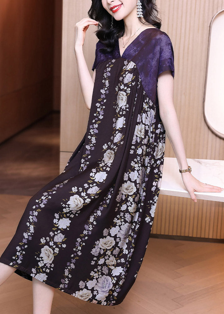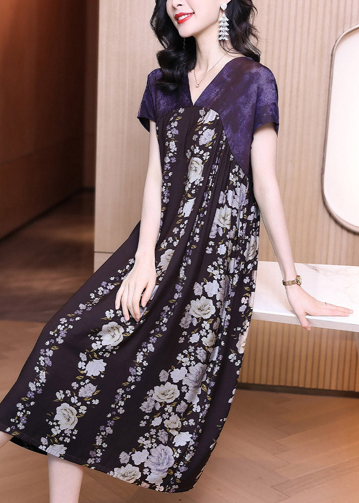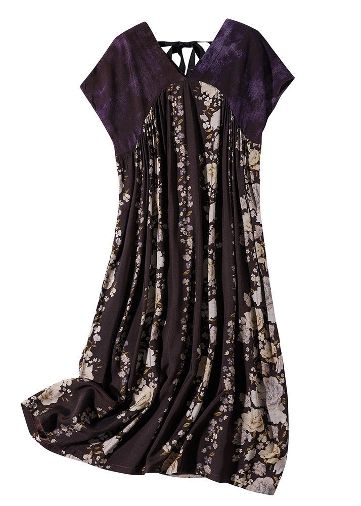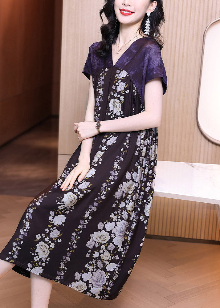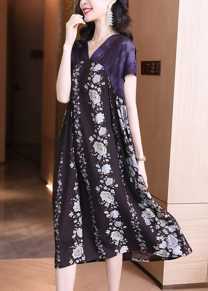 Style Purple V Neck Print Patchwork Chiffon Dress Short Sleeve