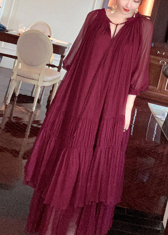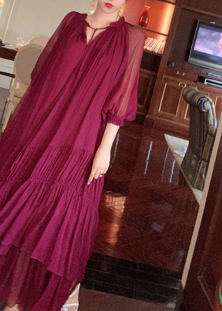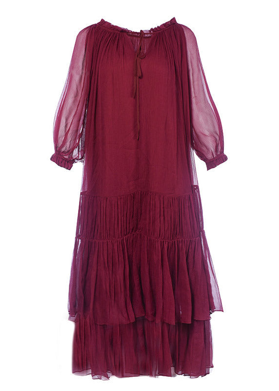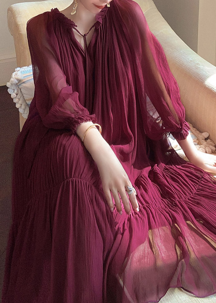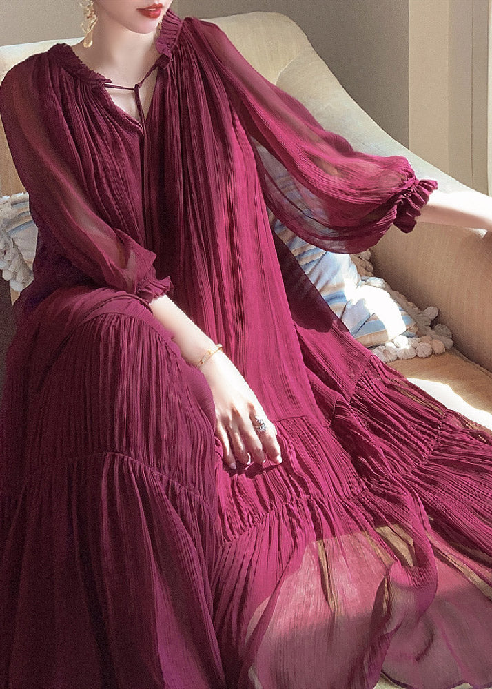 Stylish Mulberry V Neck Wrinkled Silk Holiday Dress Lantern Sleeve