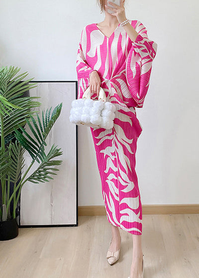DIY Rose V Neck Print Wrinkled Maxi Dress Batwing Sleeve