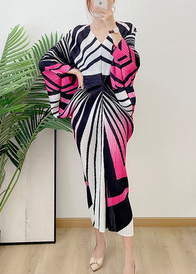 Rose V Neck Striped Wrinkled Maxi Dresses Long Sleeve