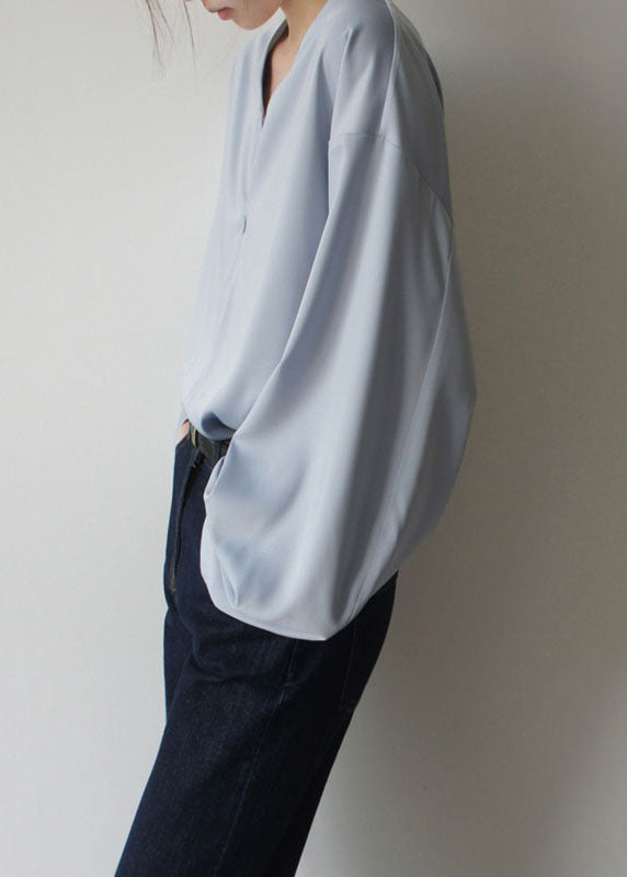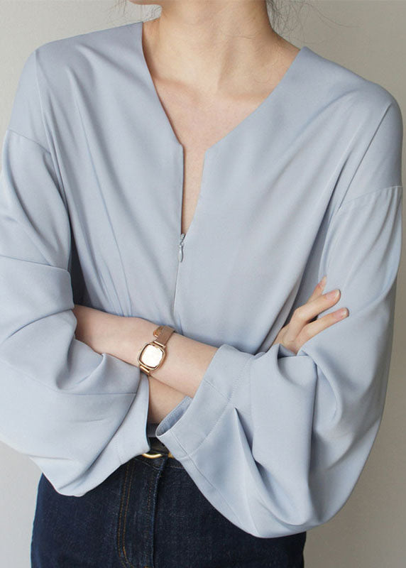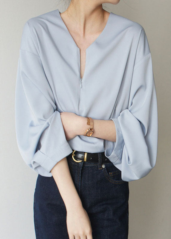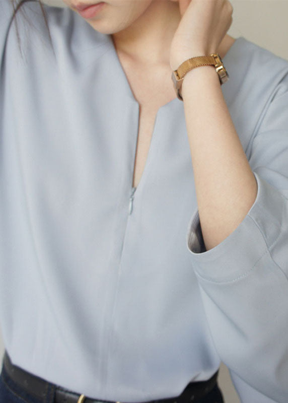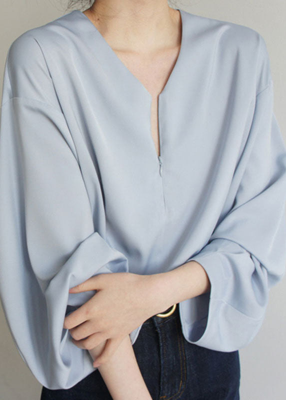 Loose Light Blue V Neck Solid Chiffon Shirts Spring