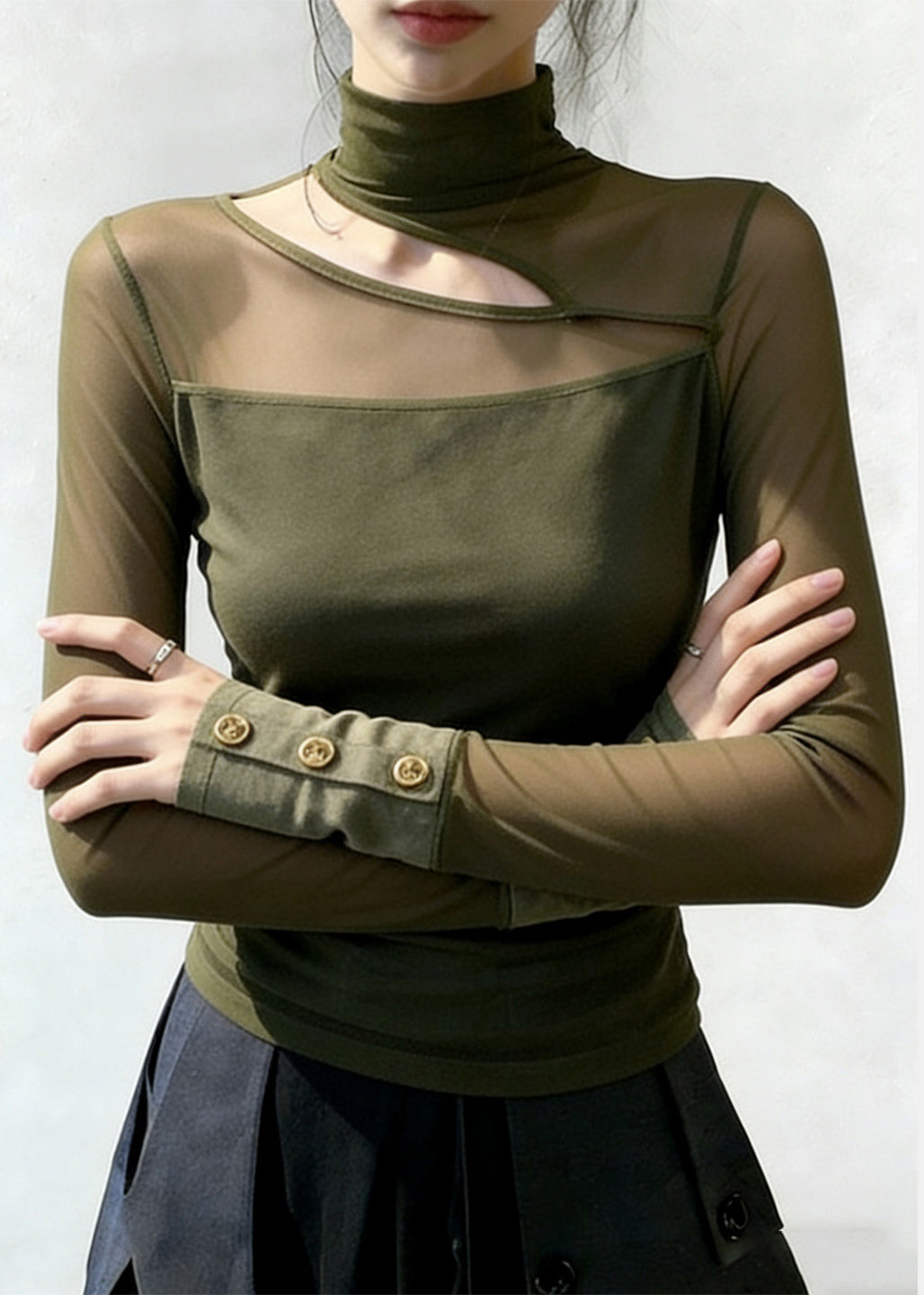 Women Green High Neck Patchwork Tulle Top Spring