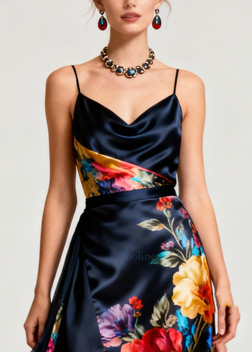 French Navy Asymmetrical Patchwork Print Silk Cami Dresses Summer