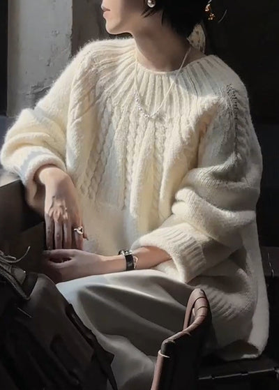 Plus Size Beige O Neck Thick Cozy Cable Knit Sweater Winter
