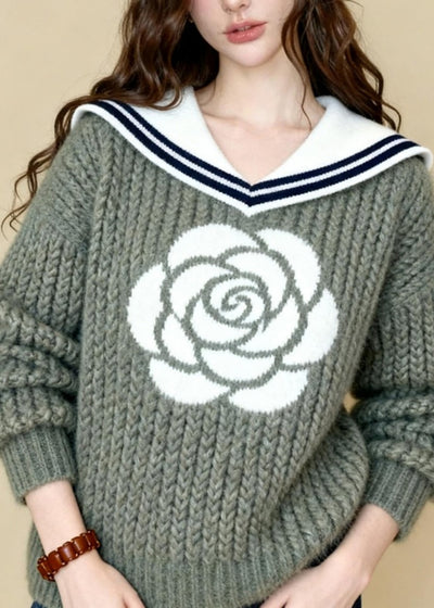 Unique Light Green Sailor Collar Rose Jacquard Knit Sweaters Winter
