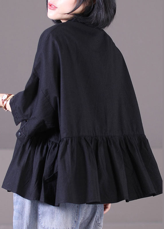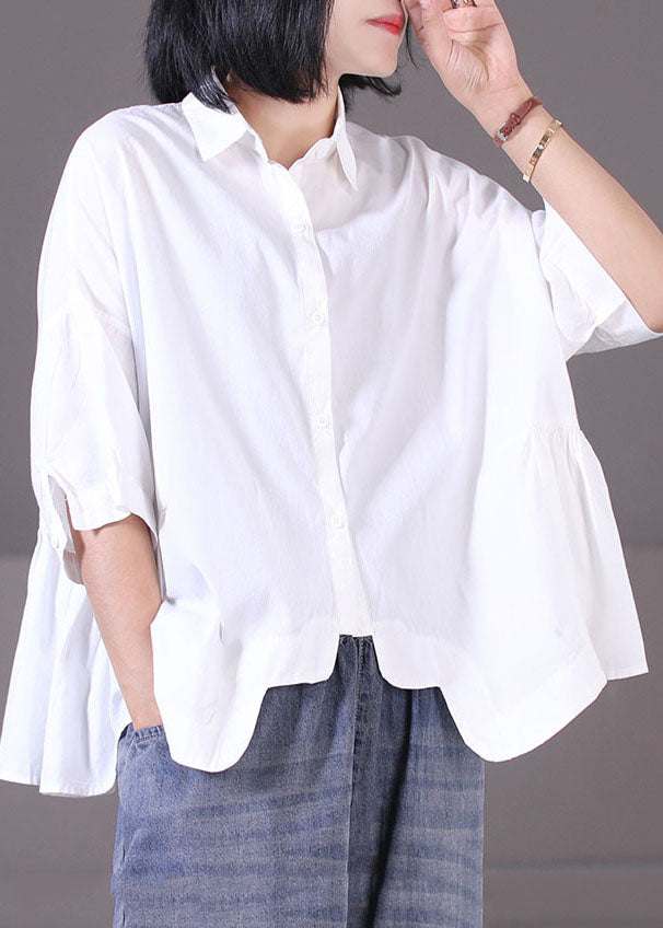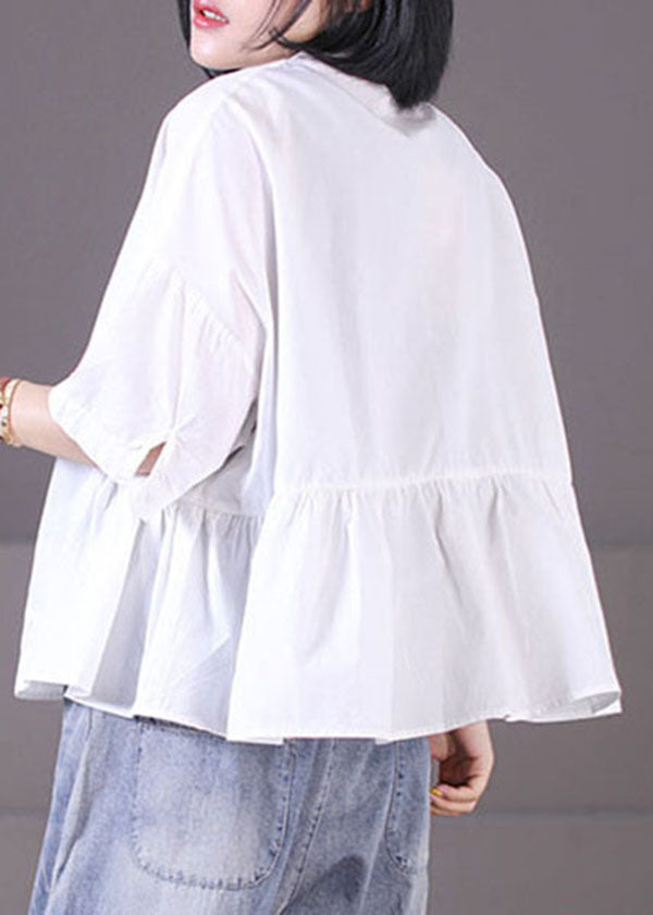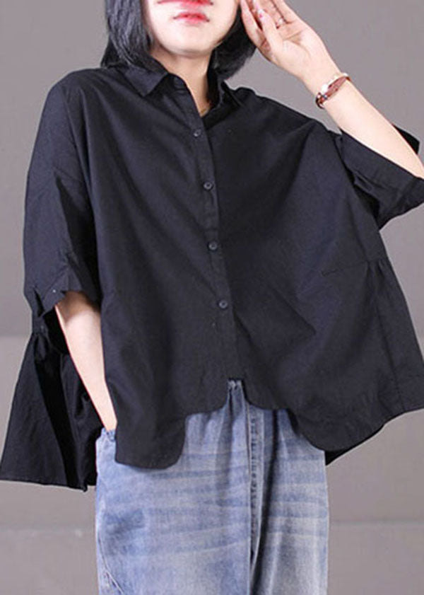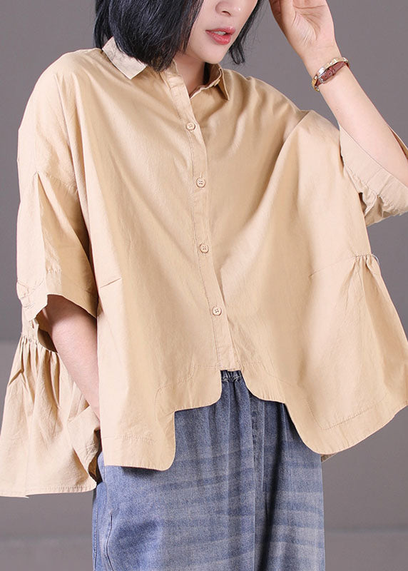 Chic Khaki Peter Pan Collar Asymmetrical Design Patchwork Wrinkled Cotton Shirt Tops Short Sleeve