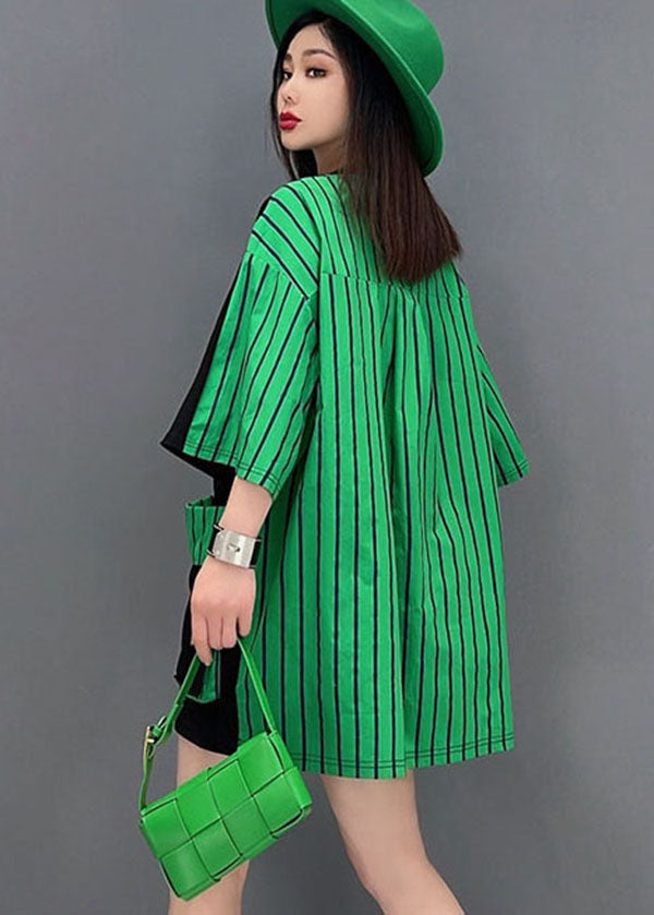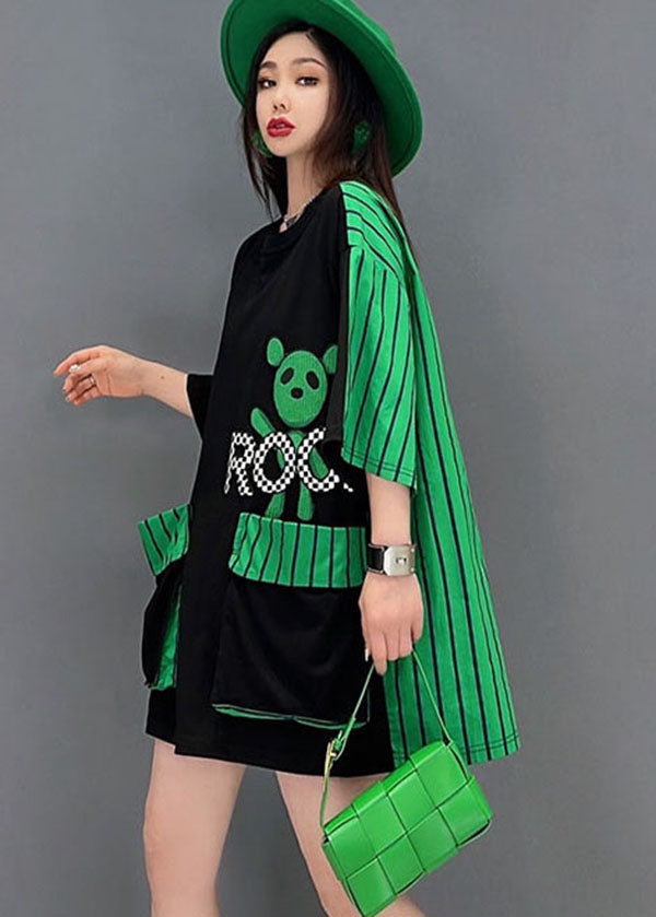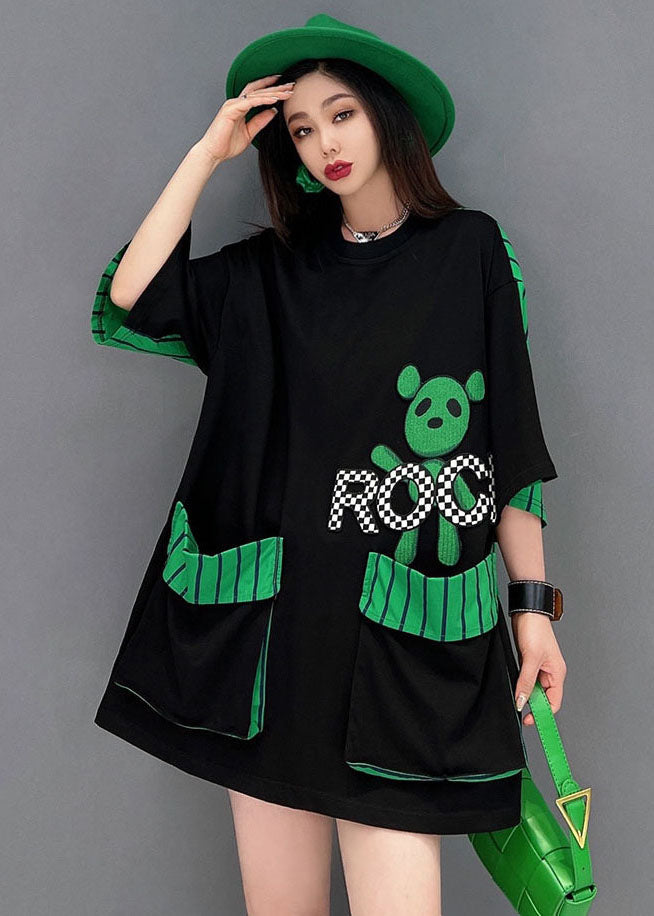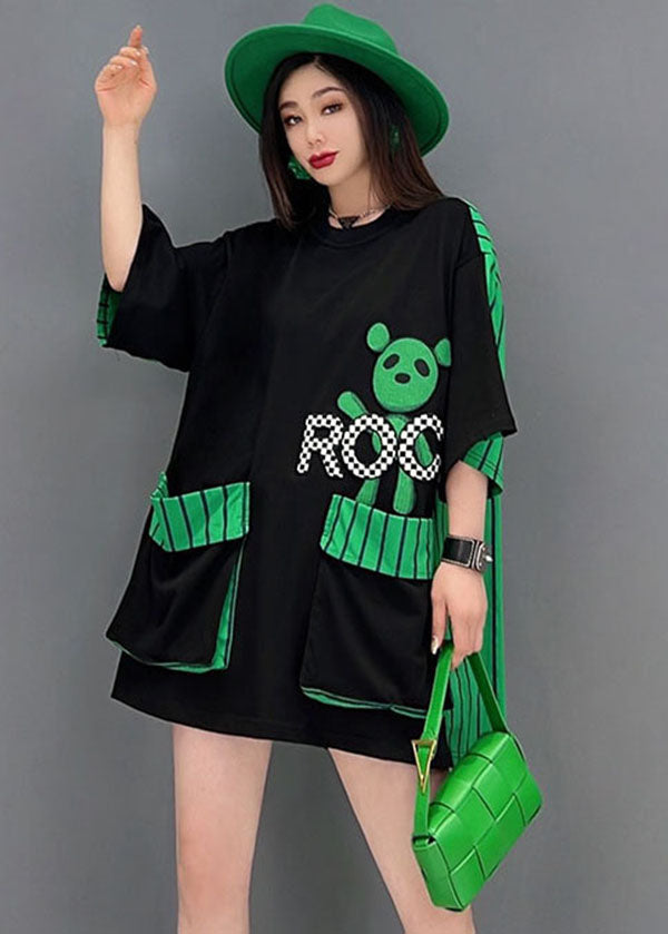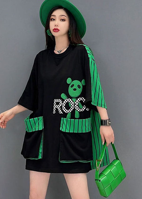 French Black O-Neck Character Print Patchwork Striped Oversized Pockets Cotton Tanks Tops Short Sleeve