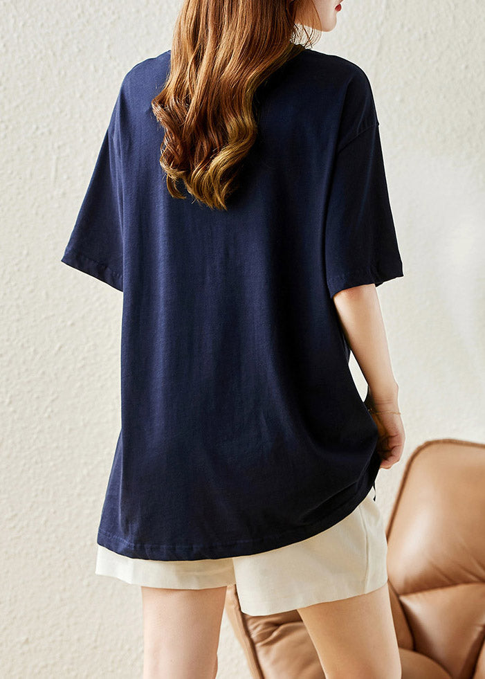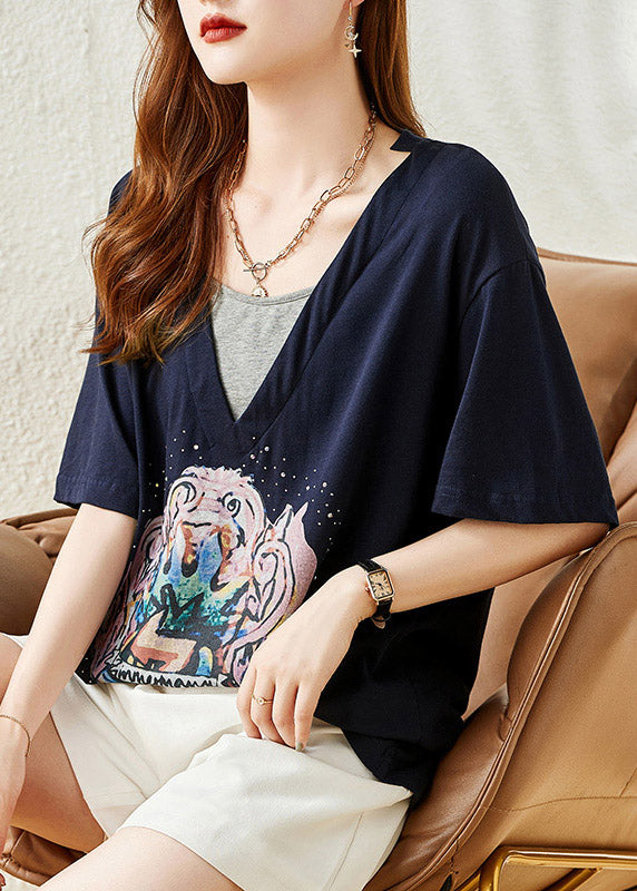 Loose Navy V Neck Print Cotton T Shirt Summer