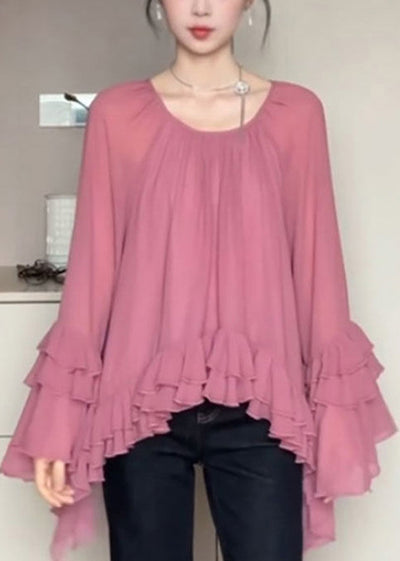 Organic Pink O-Neck Tie Lace Chiffon Shirts Flare Sleeve