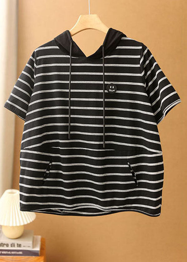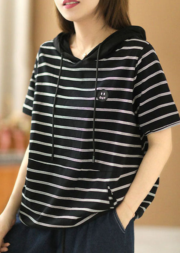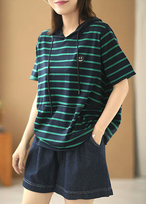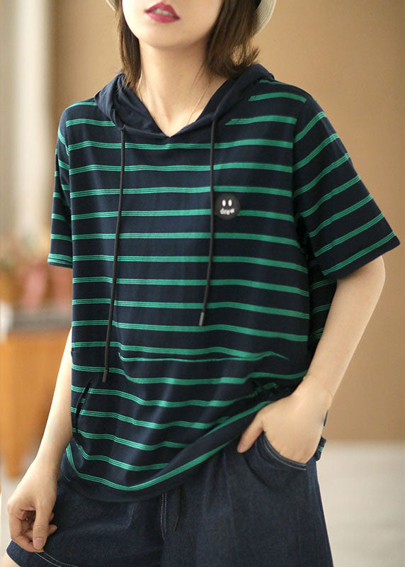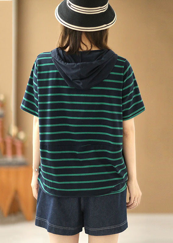 Women Navy Striped Drawstring Hooded Cotton Pullover Streetwear Short Sleeve