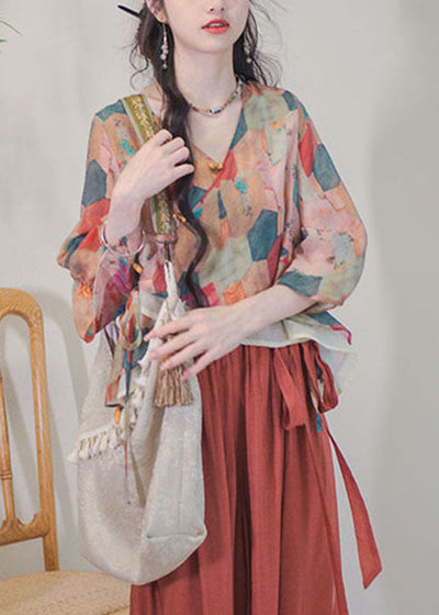 Chic Colorblock Stand Collar Tasseled Print Patchwork Silk Shirts Tops Summer