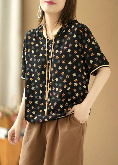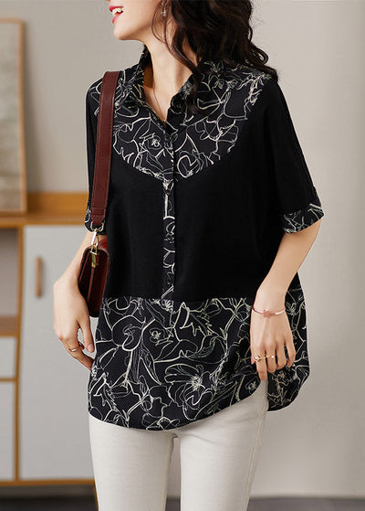 Chic Black Peter Pan Collar Print Patchwork Button Cotton Shirt Short Sleeve