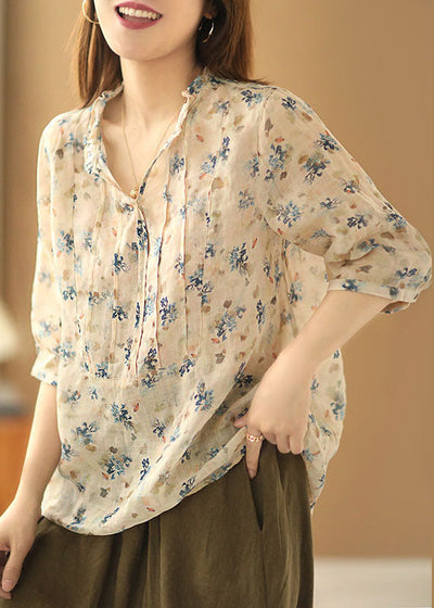 Handmade Apricot Wrinkled Ruffled Print Linen Shirt Tops Half Sleeve