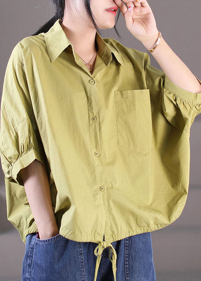 Plus Size Yellow Peter Pan Collar Drawstring Pocket Cotton Shirt Top Short Sleeve