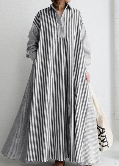 Loose Black Striped Peter Pan Collar Patchwork Cotton Dress Spring