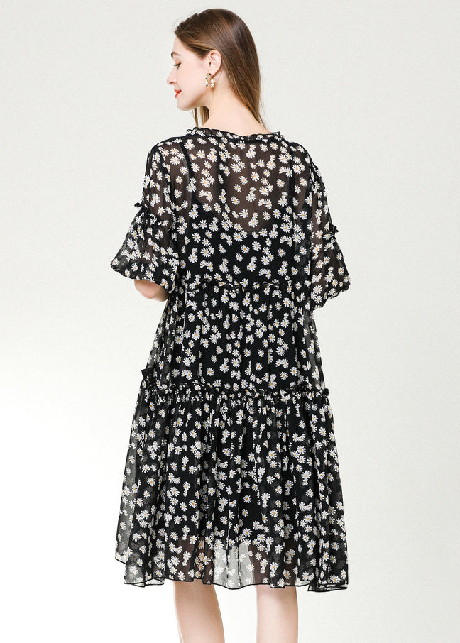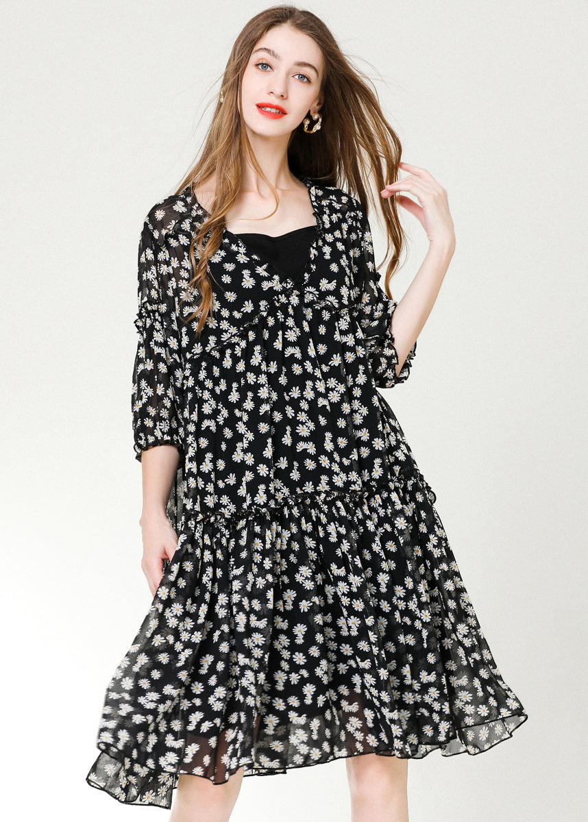 Casual Black Ruffled Print Chiffon Beach Dresses Bracelet Sleeve