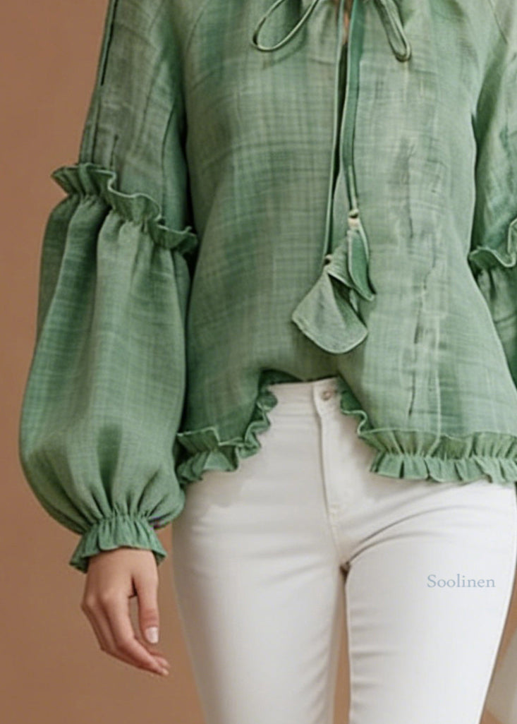 Green Lace Up Solid Cotton Blouse Top Ruffled Spring